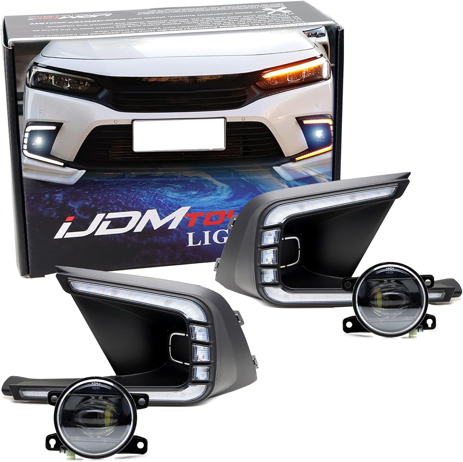 iJDMTOY Fog Bezel Replace Switchback LED Daytime Running Light Kit w/White OE-Spec LED Fog Lights Compatible with 2022-2024 Honda Civic Sedan