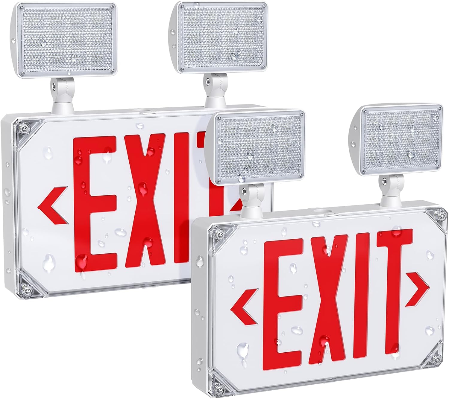 Wet Location Exit Sign with Emergency Lights,Exterior Red LED Exit Light Combo,Double Side Emergency exit sign with Battery Backup,Outdoor Waterproof Hardwired Exit Light,Two Adjustable Heads,120/277VAC,UL Listed (2 Pack)