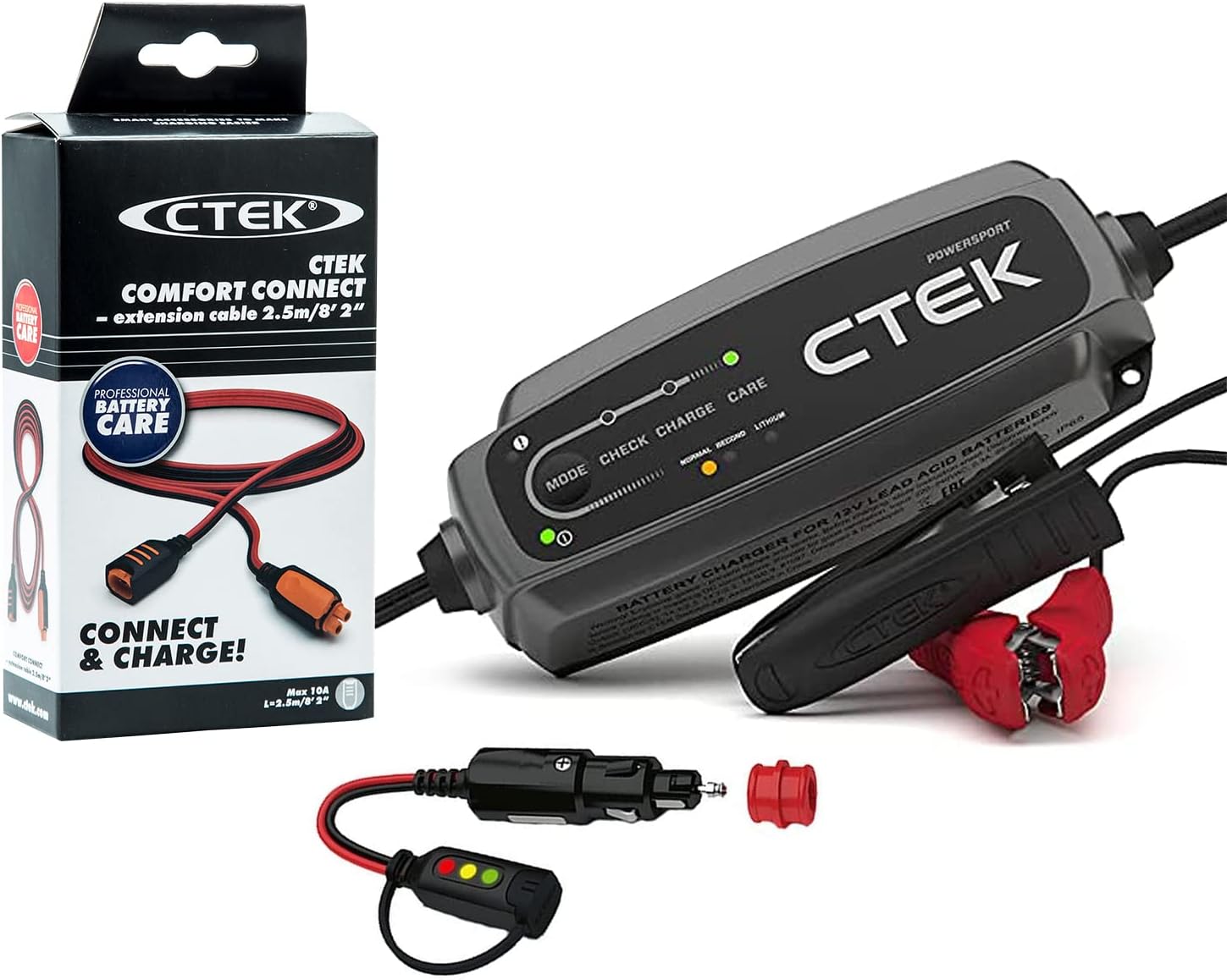 CTEK CT5 Powersport Bundle | CTEK (40-339) CT5 POWERSPORT, 12V Battery Charger for Powersport Vehicles, with CTEK (56-870) Comfort Indicator Cig Plug, and with CTEK (56-304) Comfort Connect Extension