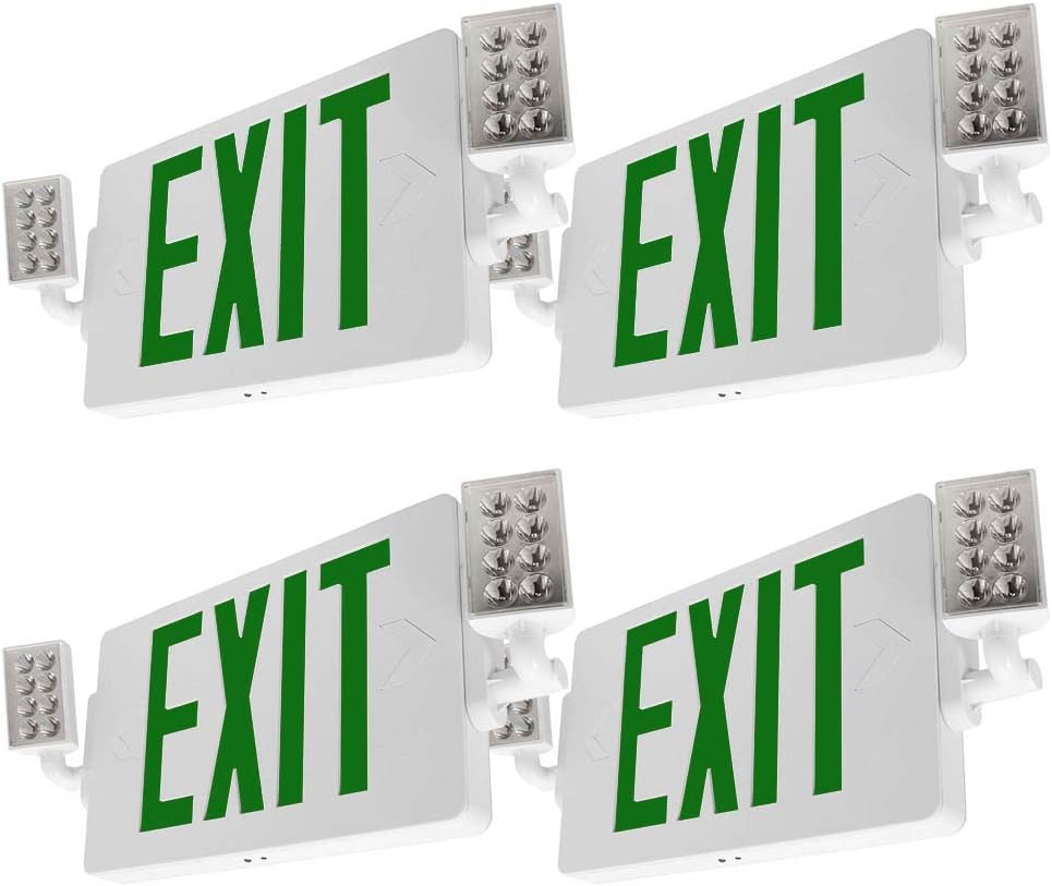 LFI Lights® Thin COMBO UL 924 Listed, Green LED, Exit Sign with Emergency Lights, White, 120-277VAC Hardwired with Battery Backup, Optional Double Face and Knock Out Arrows COMBOTGWBB 4 Pack