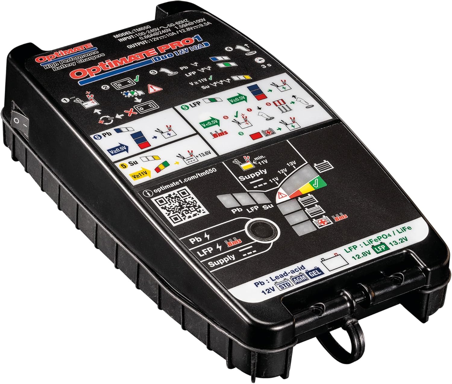 Tecmate OptiMate PRO-1 DUO 11-Step 12V/12.8V High Performance Battery Saving Charger, Tester, and Maintainer, Black