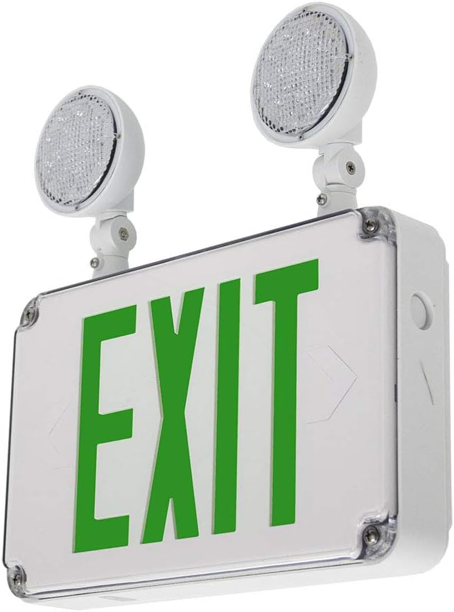 LFI Lights | Wet Location Rated Combo Green Exit Sign with Emergency Lights | White Housing | All LED | Two Adjustable Round Heads | Hardwired with Battery Backup | UL Listed | WLTCOMBO-G