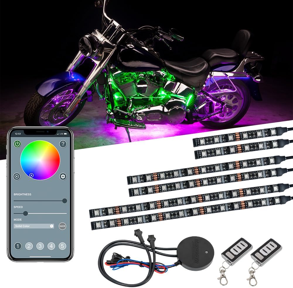 LEDGlow 6pc Bluetooth Advanced Million Color LED Motorcycle Accent Underlow Lighting Kit - Smartphone App - Dual Zone & Brake Lights Feature - Waterproof Control Box - Multi-Color Flexible Strips