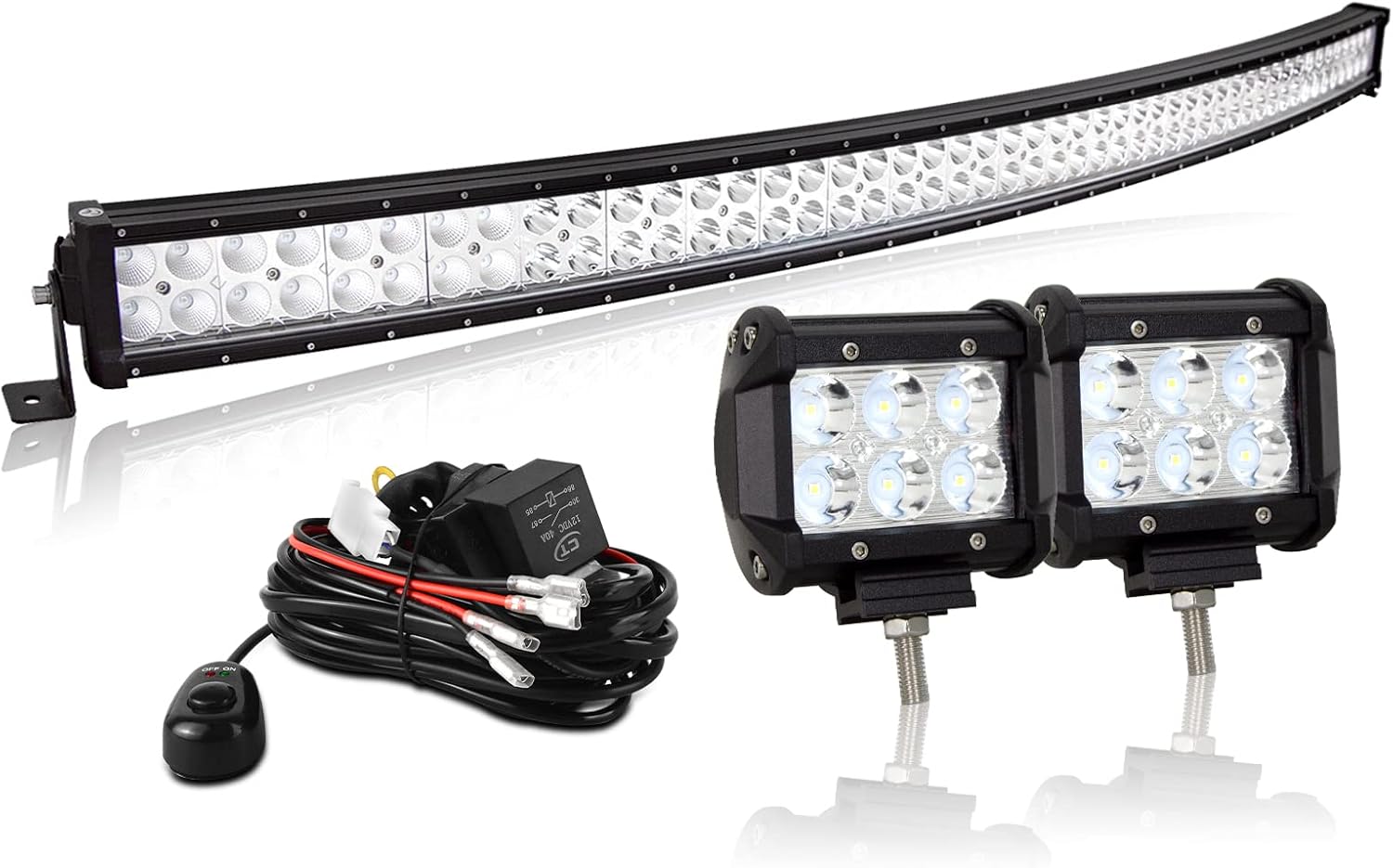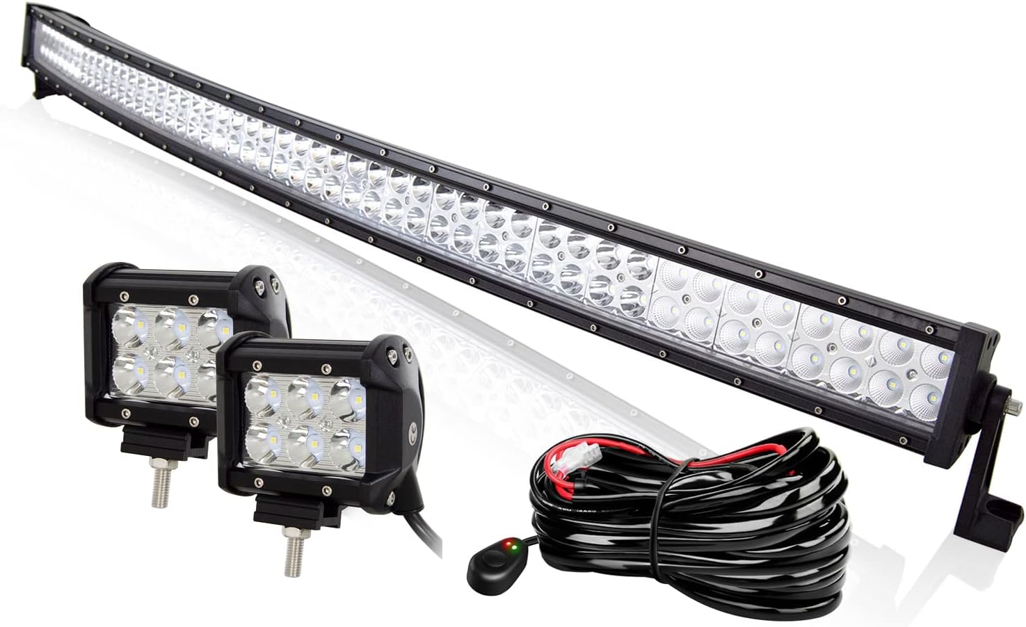AUXTINGS Curved 50 inch 288W Spot Flood Beam Led Light Bar 2X 4 inch 18W Spot LED Pods Fog Lights with 12V Wiring Harness Kit 2 Leads for Jeep Pickup Off Road Truck 4X4 ATV Boat Trailer,Waterproof