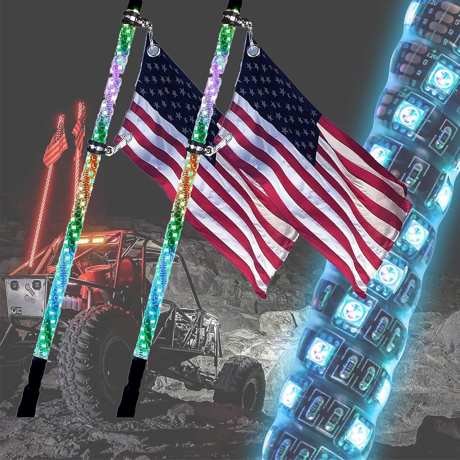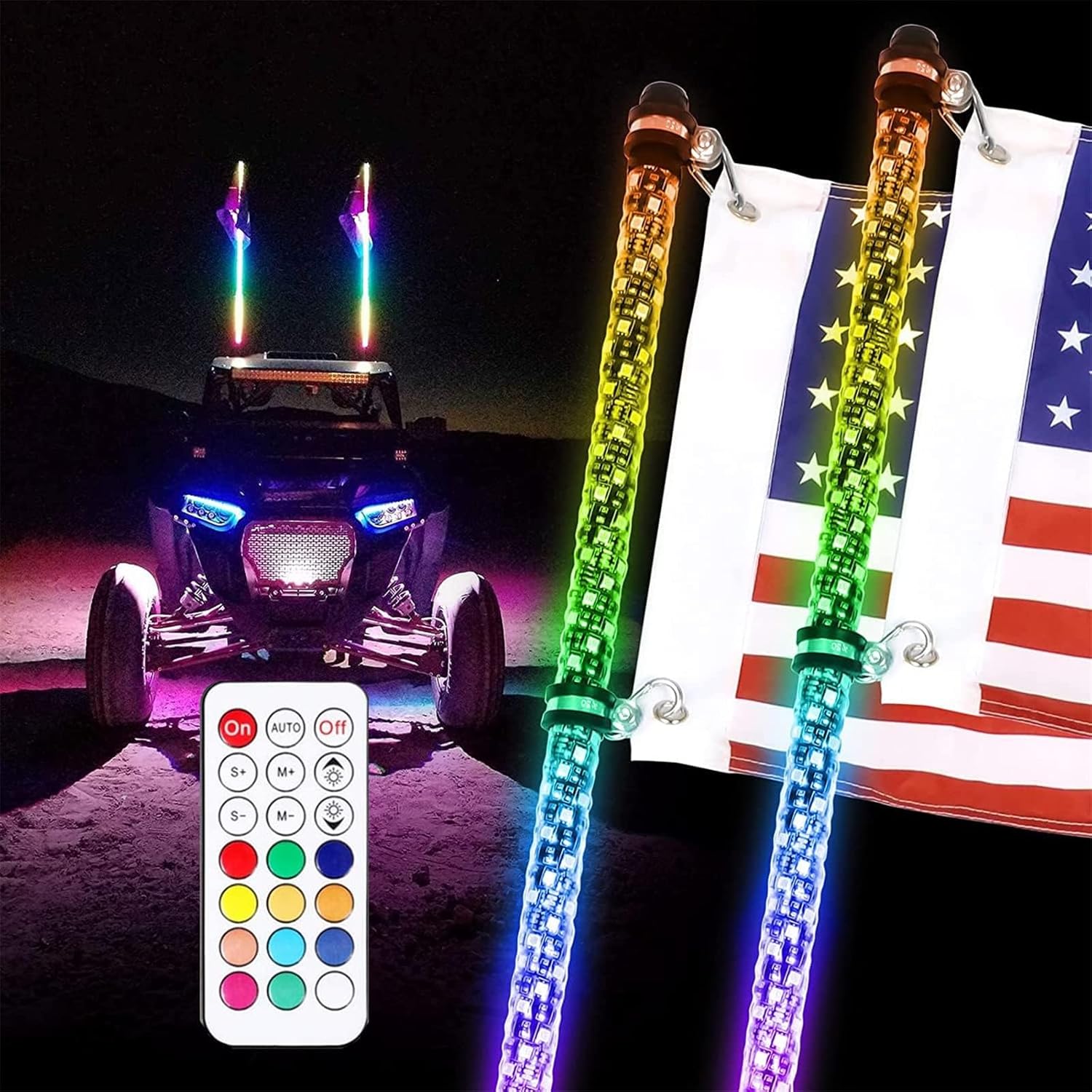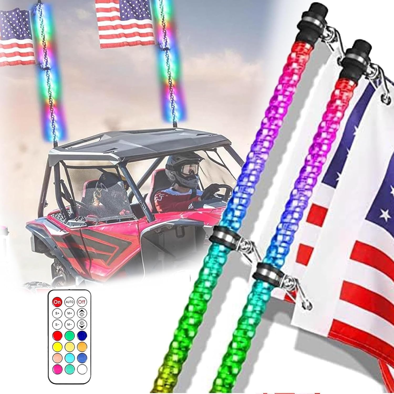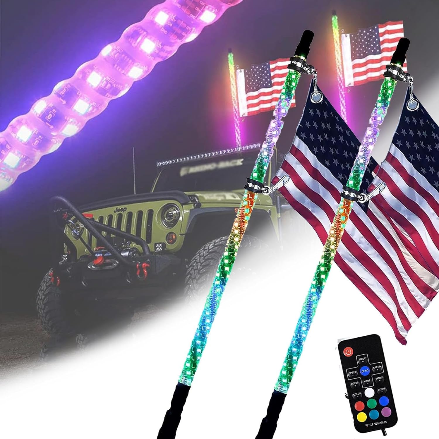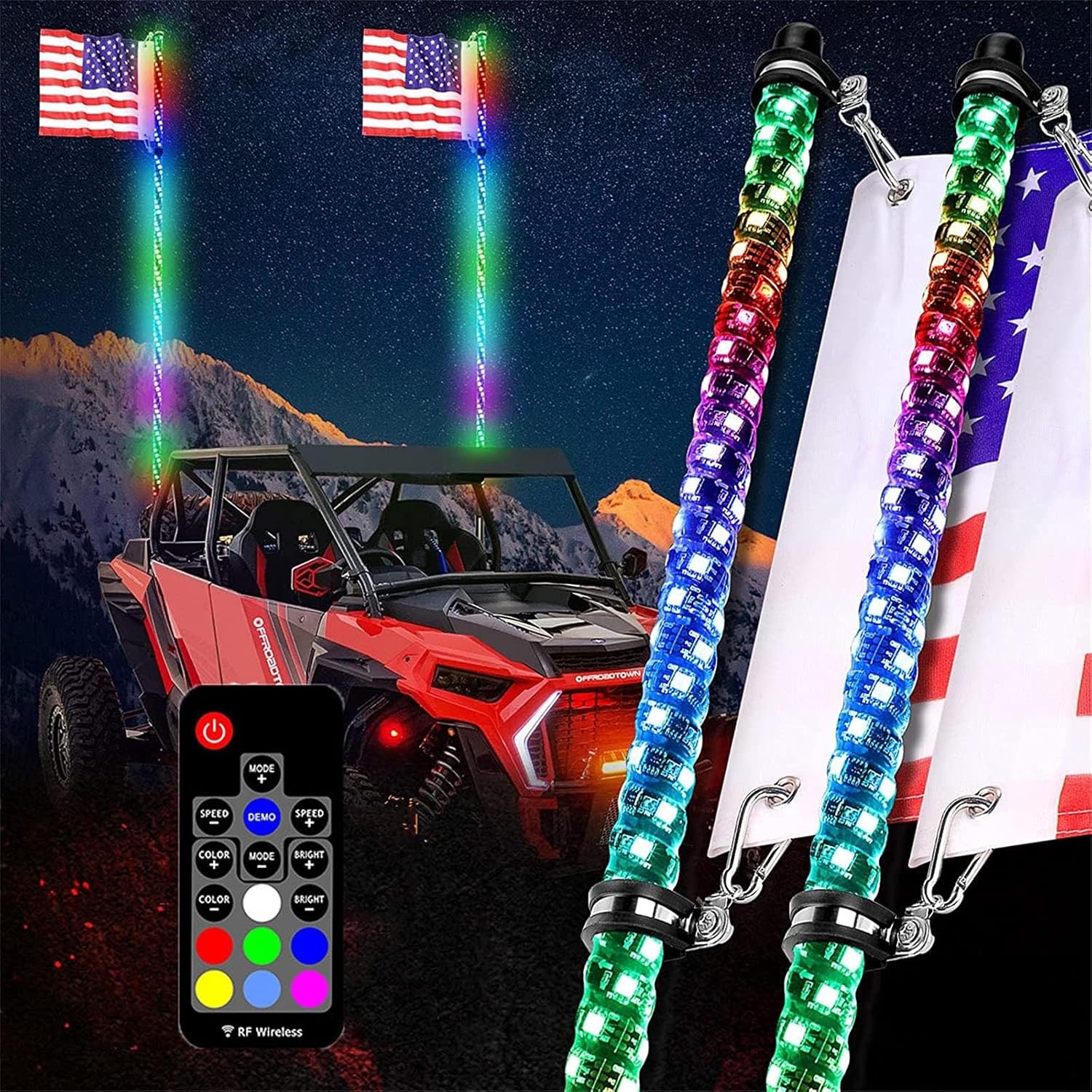 2pcs LED Whip Light Antenna Flag, 4FT Spiral RGB Led Whip Light, RF Remote Control Lighted Antenna Whips for ATV UTV Offroad Sand Dune Buggy