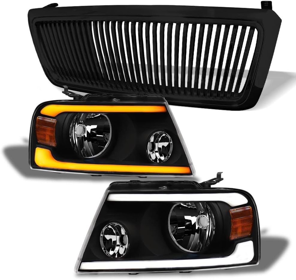 7422442480449 Compatible with 2004-2008 Ford F150 Switchback Sequential LED Strip Bar Black Housing Headlights with Amber Reflector + Glossy Black Vertical Front Bumper Grill Grille