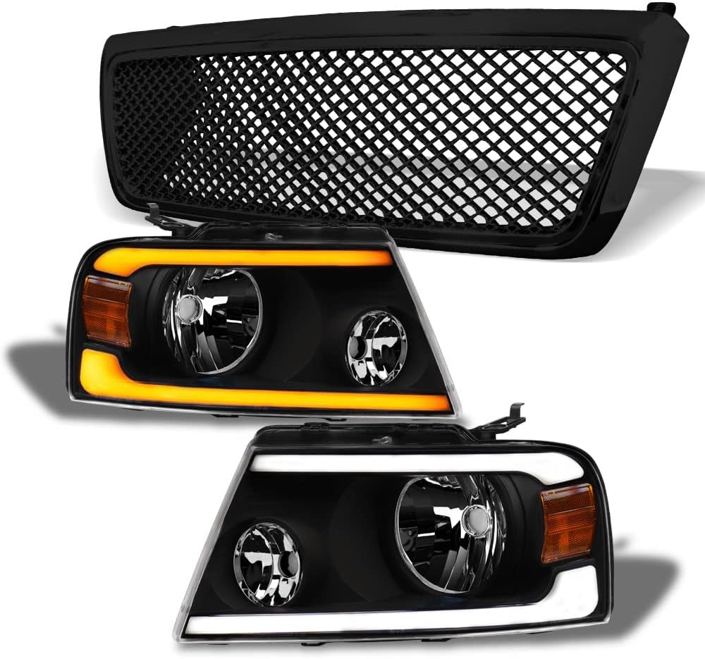 Switchback Sequential LED Strip Tube Bar Black Housing Crystal Headlights Signal Lamps Amber Reflector nb + Glossy Black Mesh Front Hood Bumper Grill Grille Guard ABS Compatible with 04-08 Ford F150