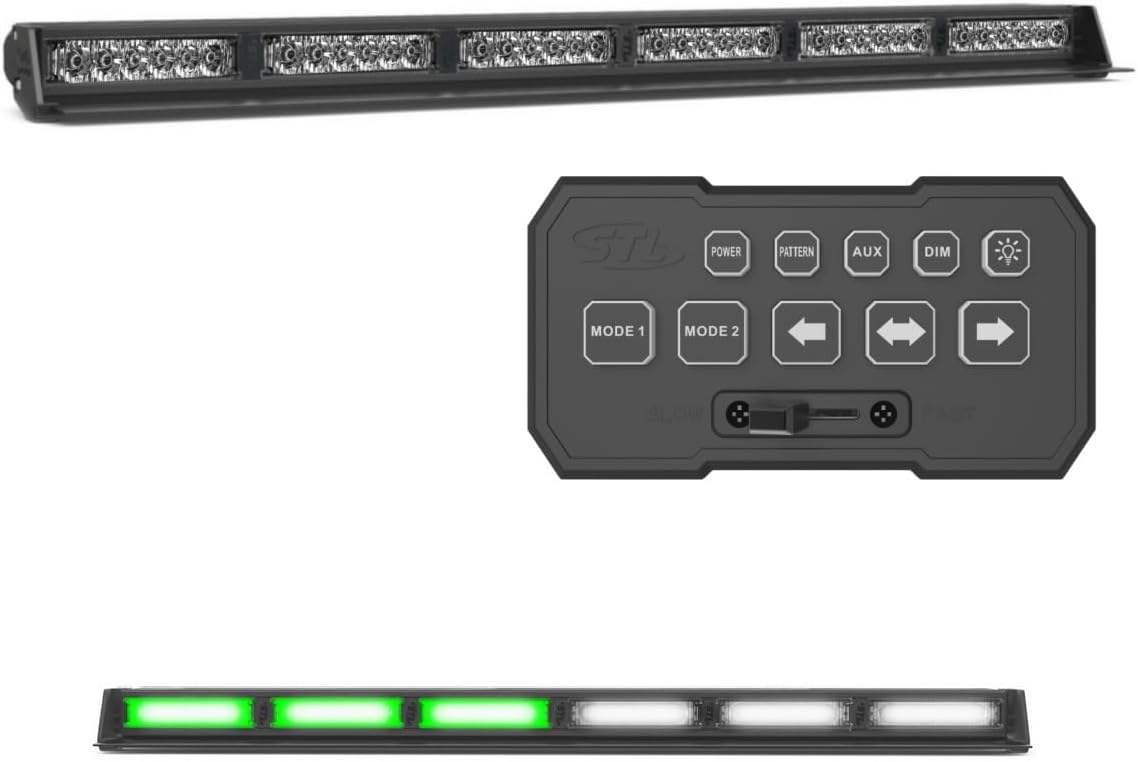 SpeedTech Lights Striker Elite TIR 6 Head LED Strobe Light Bar – 36 LEDs 108W Dash Deck Traffic Advisor Windshield Mount for Police, Security & Emergency Vehicles (Green/Clear)