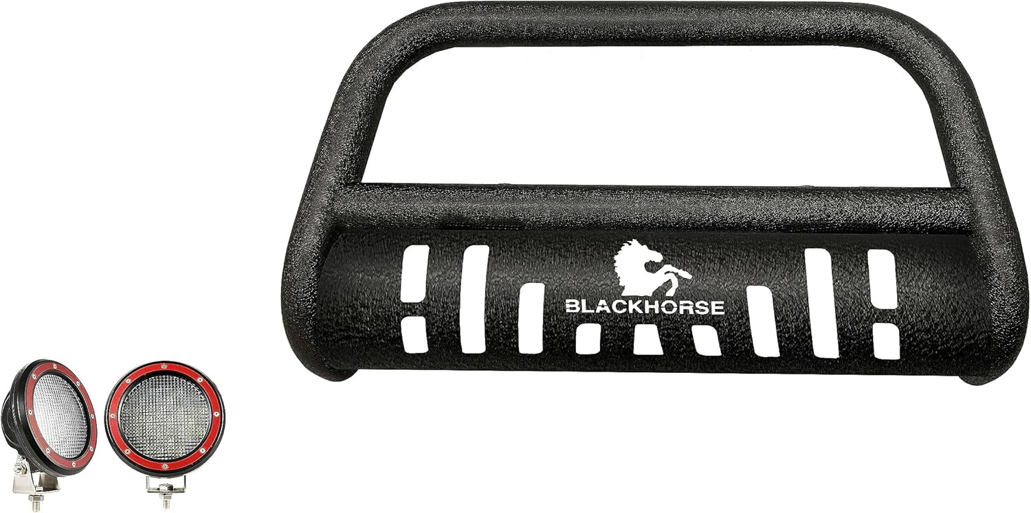 Black Horse Bull Bar-T Textured Black Come with Pair of 5.3" Dia. LED Flood Lights with Black Trim Rings Compatible with 2003-2014 Mitsubishi Endeavor-CBT-B801SP-PLFB