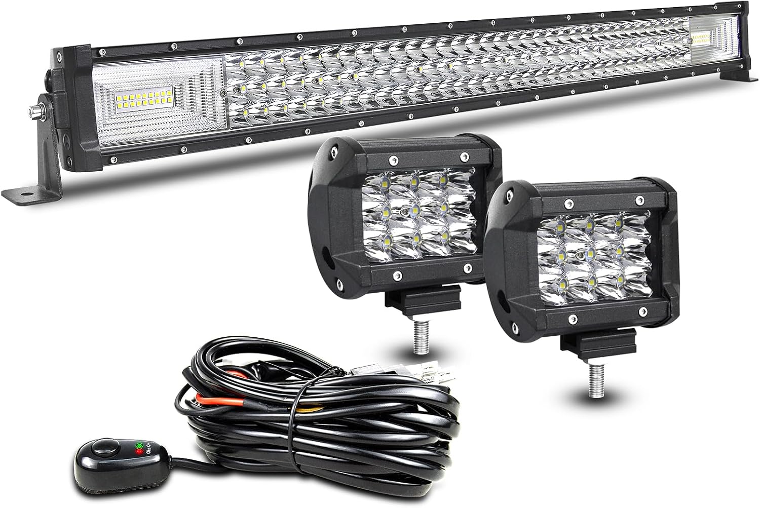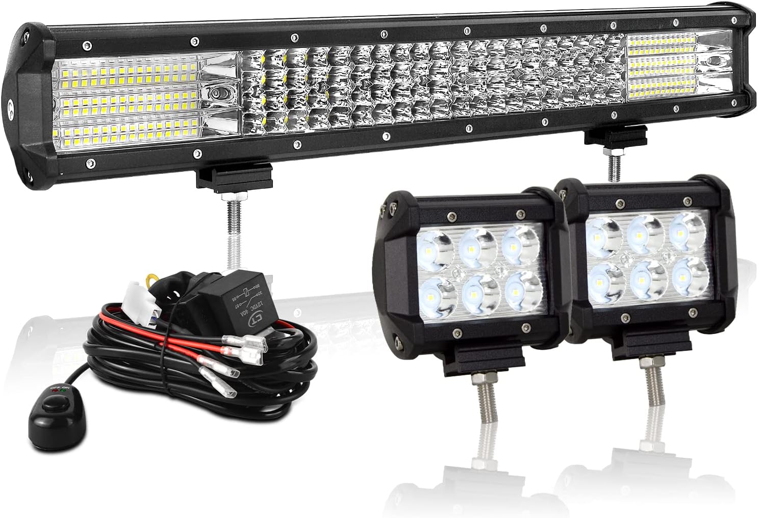 AUXTINGS 32 inch Straight Led Light Bar Spot Flood Beam +2X 4 inch 36W Spot LED Pods Fog Lights with 12V Wiring Harness Kit 2 Leads for Jeep Pickup Off Road Truck 4X4 ATV Boat Trailer,Waterproof