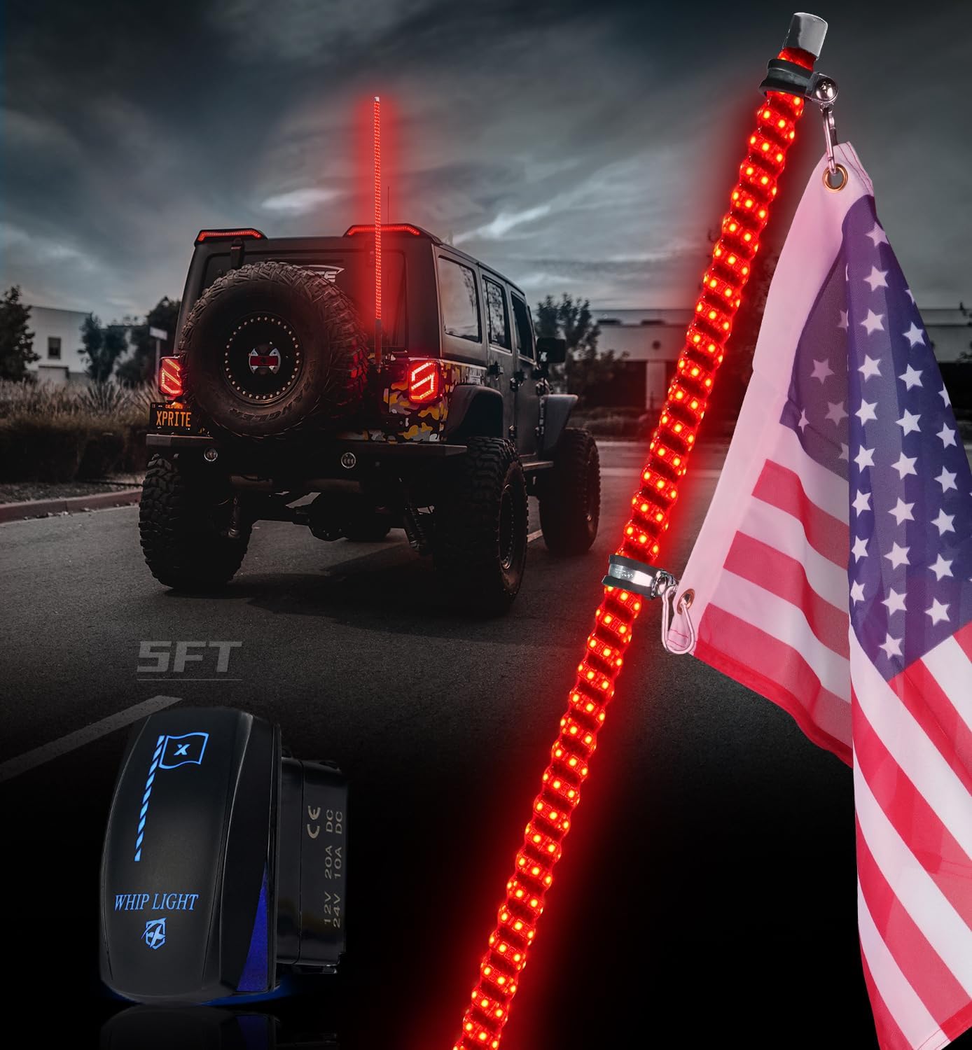 Xprite 1PC 5FT Red Spiral LED Whip Lights with Built-in Spring Base, Safety Lighted Antenna Whip Pole w/Rocker Switch American Flag, Compatible with SXS ATV UTV Polaris RZR Can-am Trucks Jeep