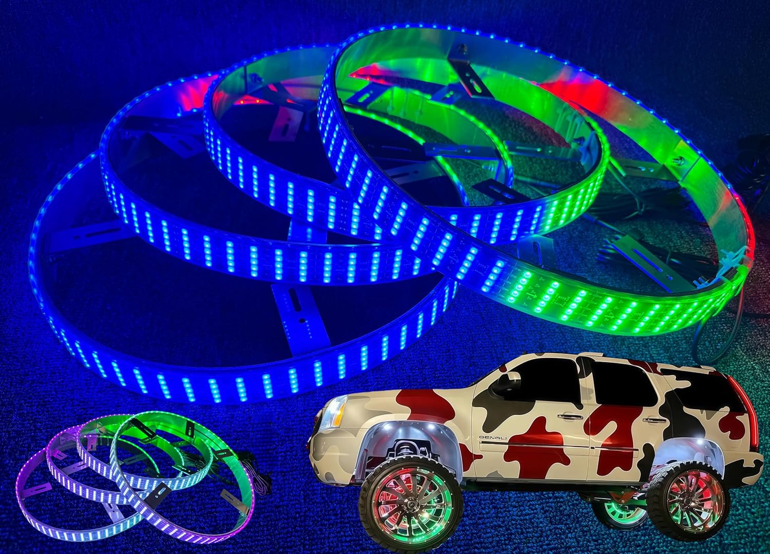 4 PCS 15.5" 5-Rows RGB Dream Color Chasing Flow Series Wheel Rim Lights - APP/RF Control, Strobe Flash Breath Modes, Weatherproof Tire Rings, Wheel Lights for Truck, Car & Off-Road