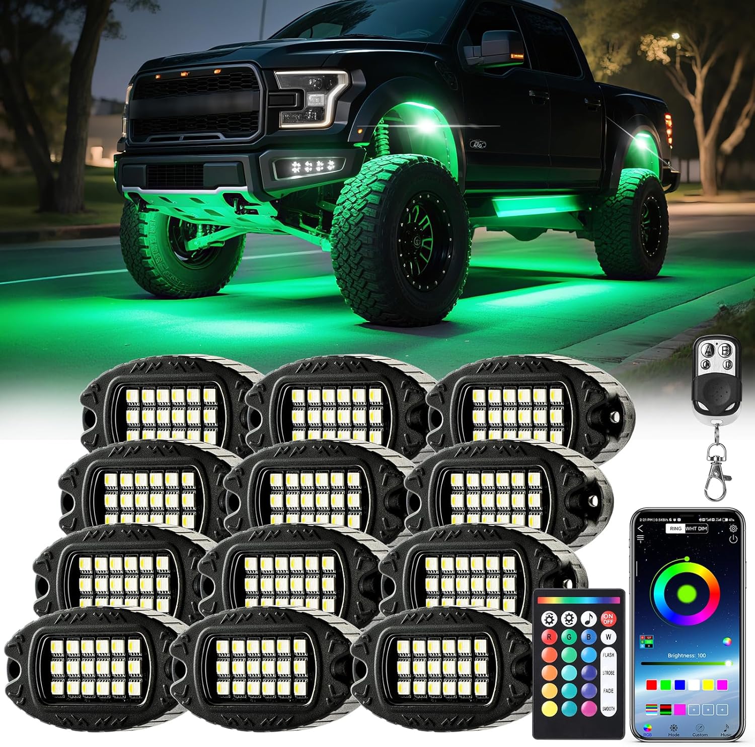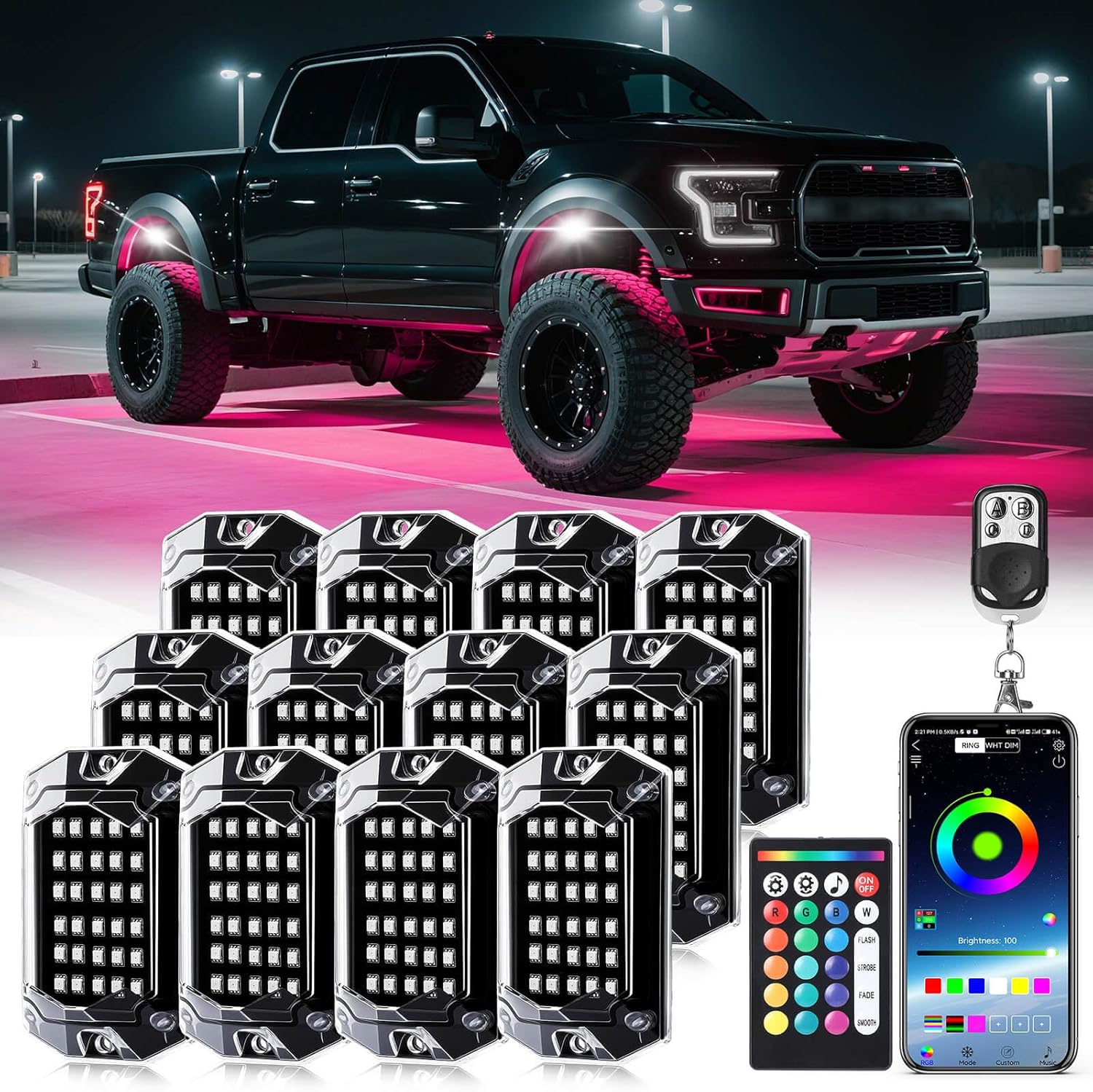 12 Pods RGB LED Rock Lights for Trucks ATV UTV Golf Cart RZR Offroad SUV Cars, Waterproof Multicolor Neon Underglow Kit with Bluetooth APP/RF Remote Control, Vehicle Accent Underbody Light 12V