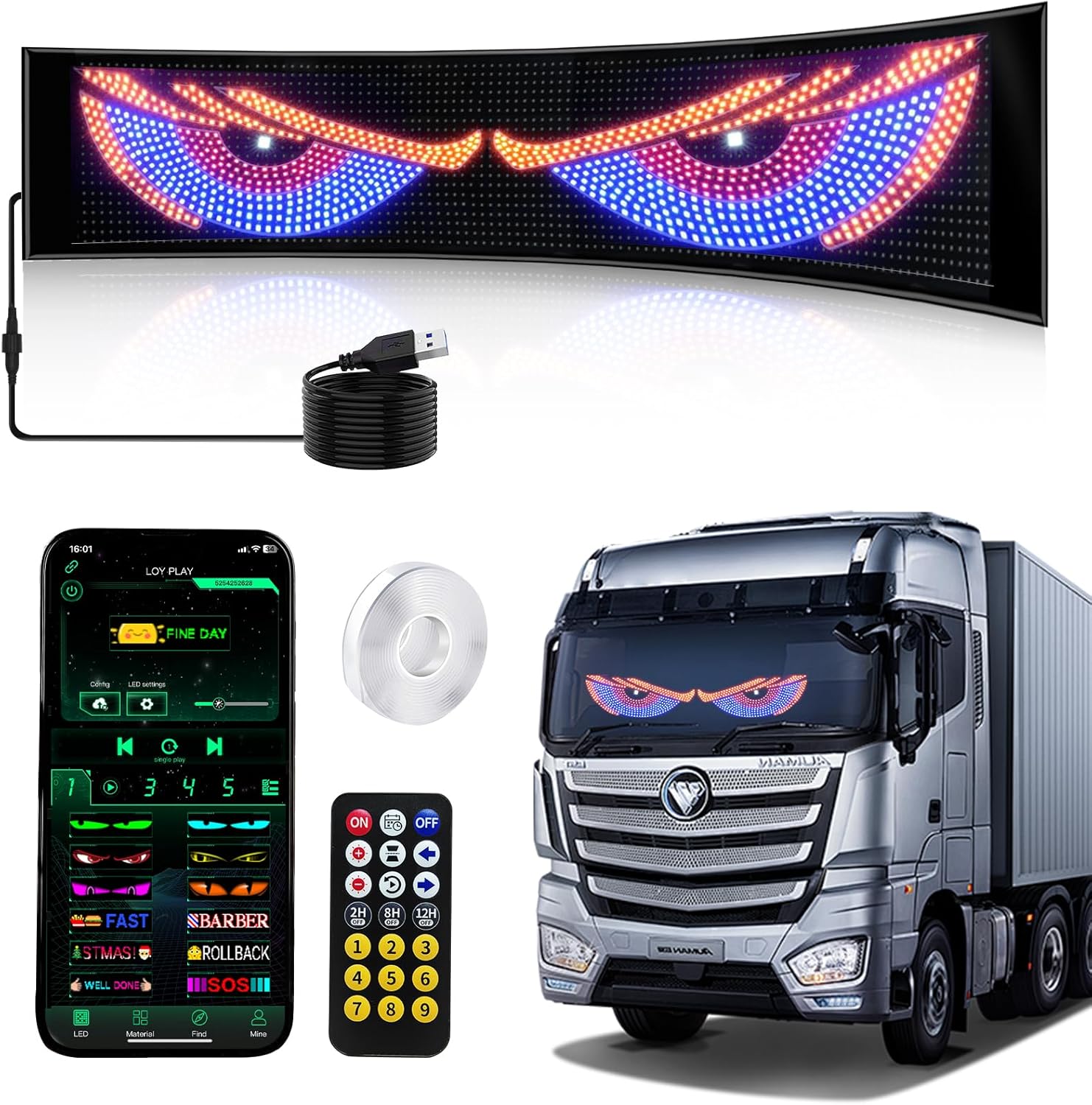 wonhag Ojos LED para Carro: 35"x7.5" Large LED Eyes for Car Windshield, Customizable Devil Eyes Light for Windshield, Flexible Car Eye Animated Display with App & Remote Control