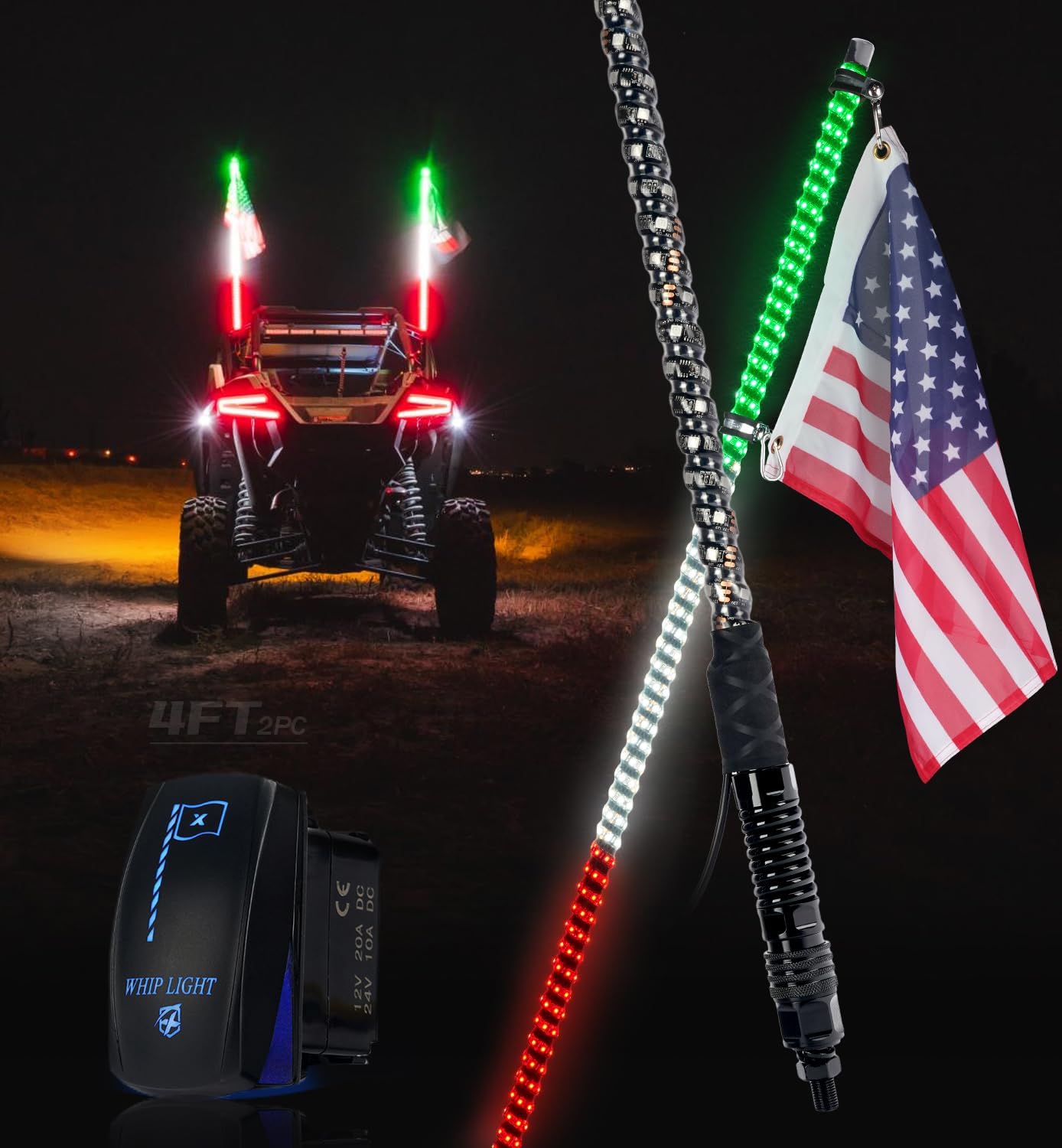 Xprite 2PC 4FT Green White Red Spiral LED Whip Lights with Built-in Spring Base, Safety Lighted Antenna Whip w/American Mexico Flag, Compatible with SXS ATV UTV Polaris RZR Truck Jeep