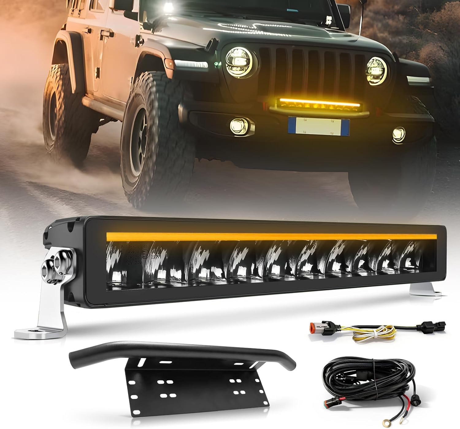 CO LIGHT 21 Inch LED Light Bar Single Row 65W 15000LM White Amber DRL Anti Glare 780M Range Offroad IP68 DOT Approved with Wiring Harness for Truck SUV ATV UTV Tractor with License Plate Bracket