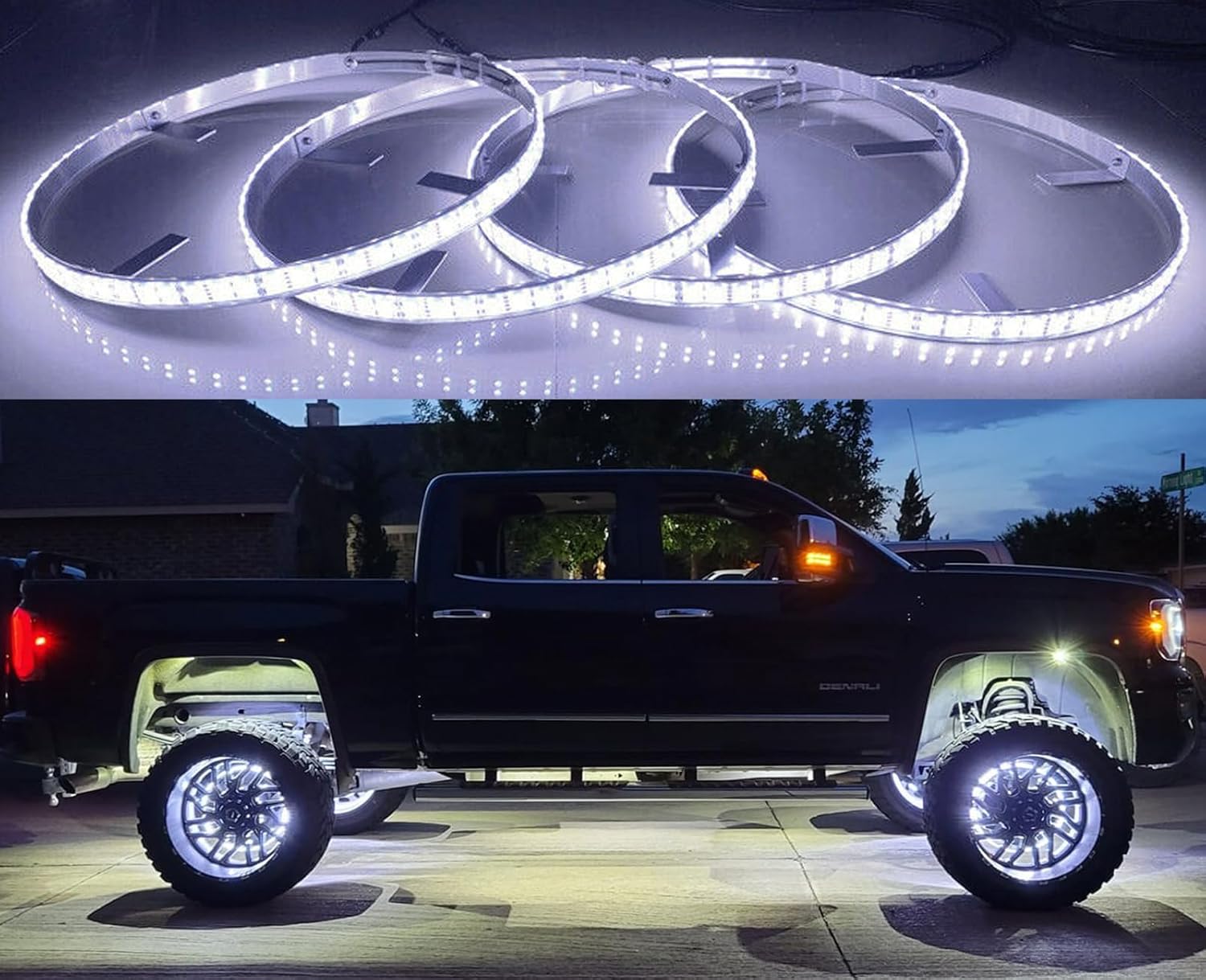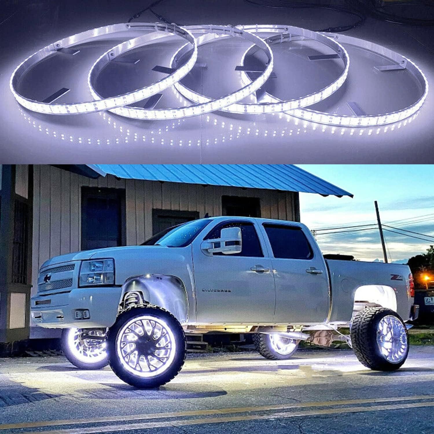 4PCS 15.5" Double Row White Wheel Lights - Pure White & Cold White, Strobe/Flash/Breath Modes, IP68 Waterproof, Bluetooth Control, for Truck, Car, Pickup, SUV,