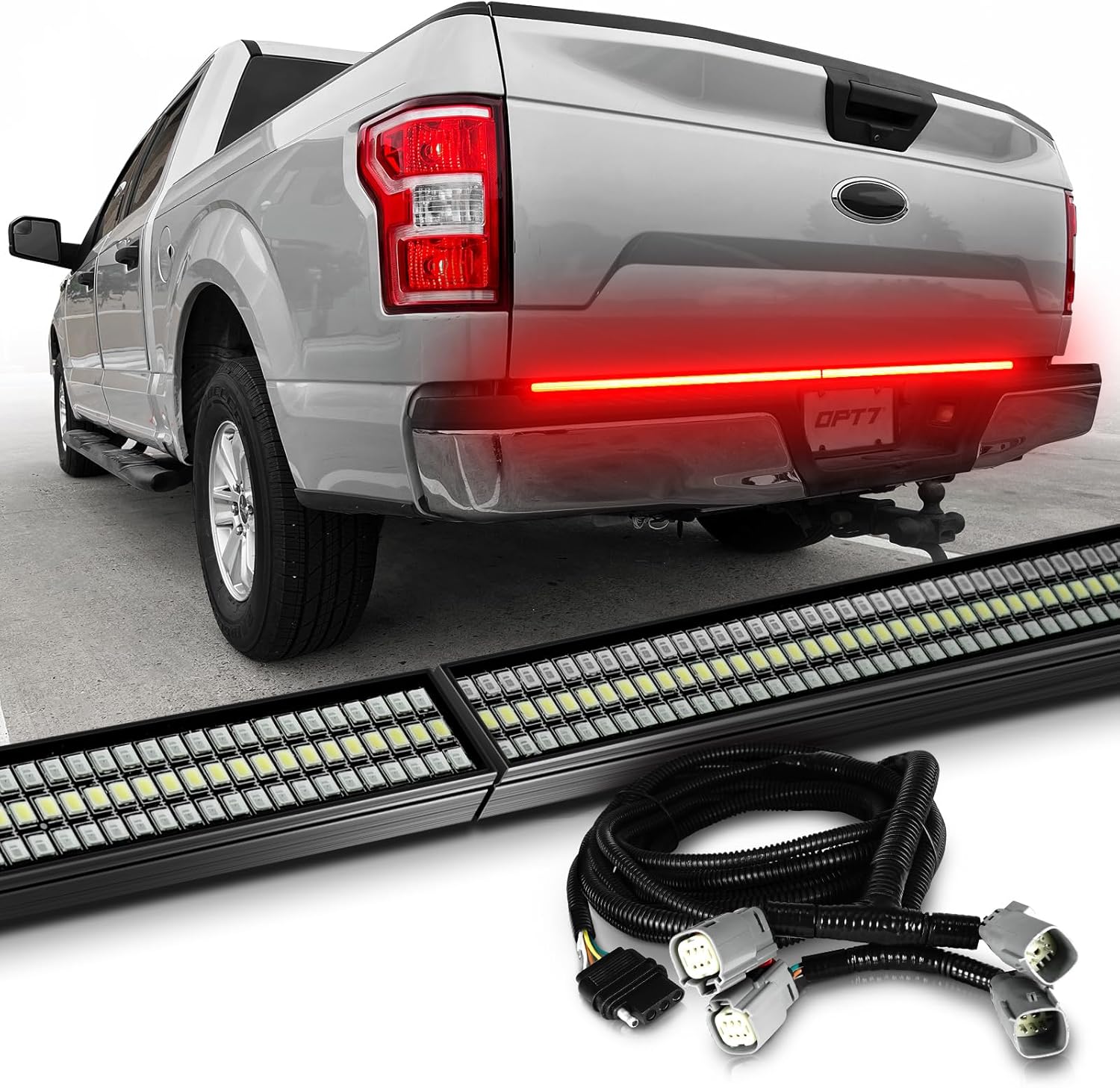 OPT7 Plug'n'Play Bundle for 2018-2020 F150 Without Blind Spot Monitor – 60" Redline Triple Row Two-Piece LED Tailgate Light Bar w/Sequential Red Turn + Easy Connect Harness