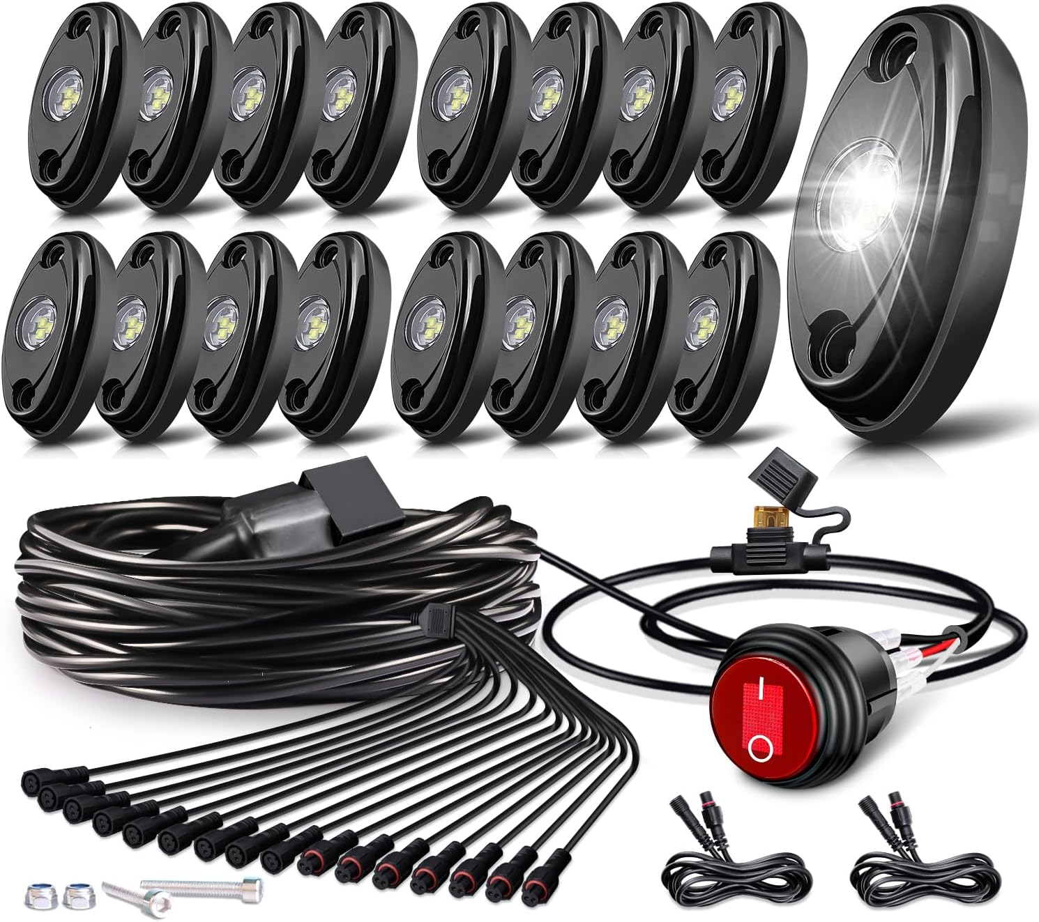 White Rock Lights,LEDMIRCY R1 LED Rock Lights Kit with Toggle Switch Wiring Harness 16PCS Luces para Carro for Trucks ATV UTV Under Glow Light High Power IP68 Waterproof