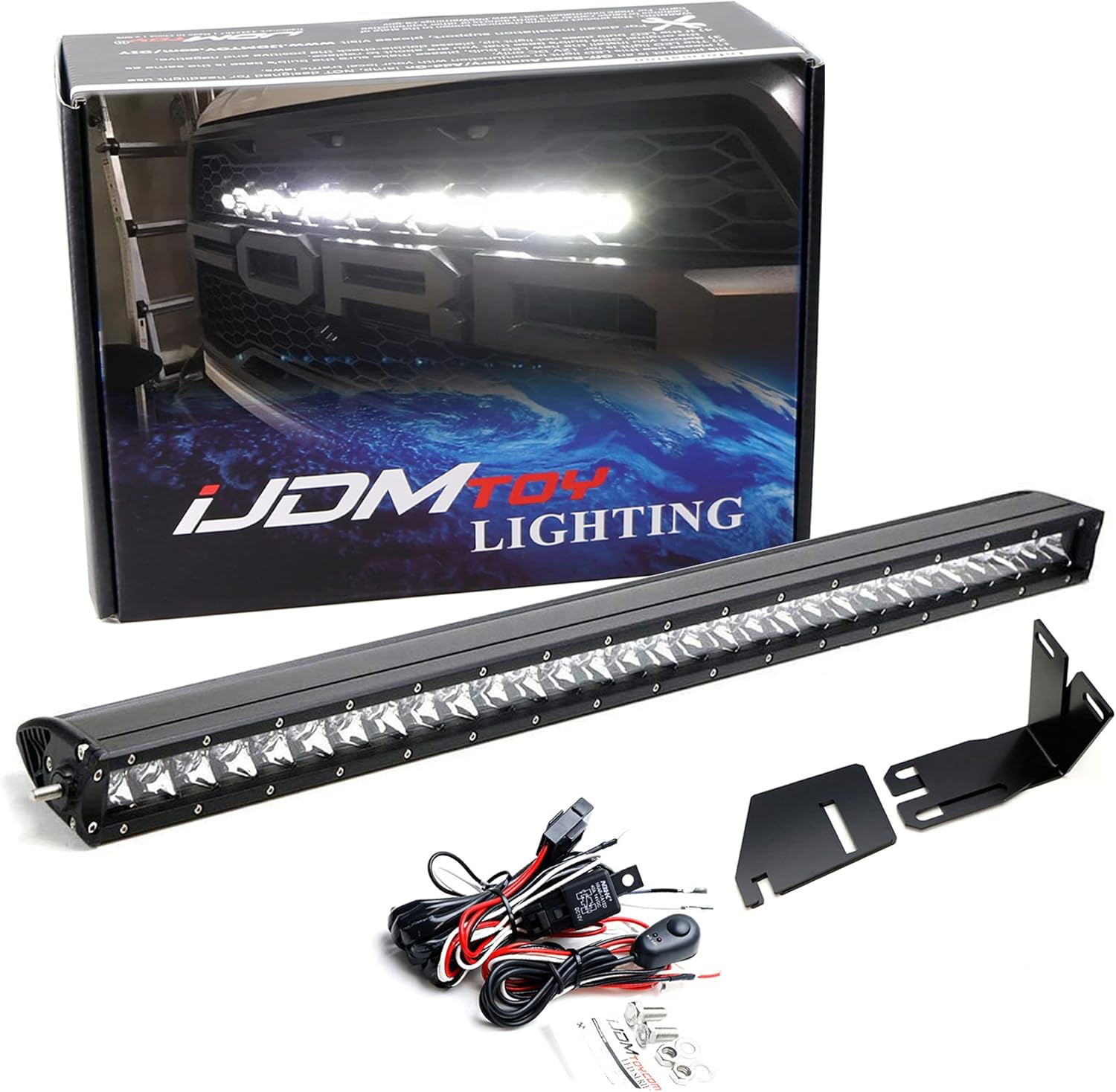 iJDMTOY Invisible 30-Inch LED Light Bar Kit Compatible with 2017-2020 Ford Raptor, (1) 150W High Power Single-Row LED Lightbar, Behind Grille Shutter Mounting Brackets, Relay & On/Off Switch