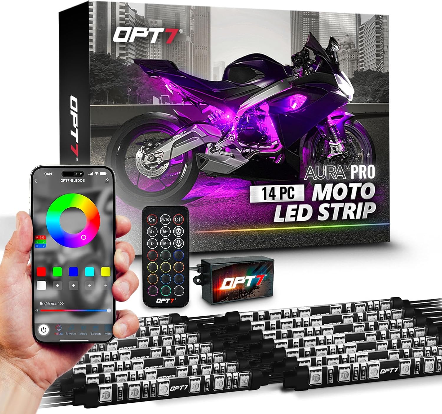 OPT7 Aura Pro 14pcs Motorcycle RGB LED Strip Lights with App & Remote Control, Multi-Color & Music Sync Neon Accent Bike Underglow Lighting Kit, 12V Handle Switch for Harley Honda Yamaha Kawasaki