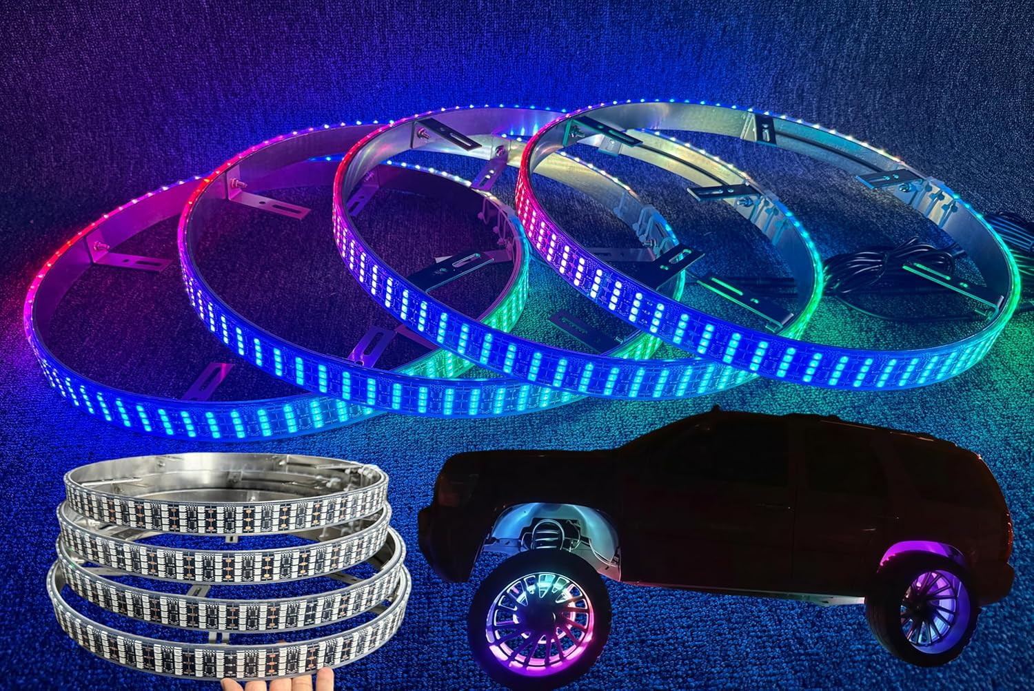 17.5" Double Row Chasing Flow LED Wheel Lights + 2PCS 4FT + 2PCS 6.5F Underglow Strips 8PCS Dream Color Lights KIT Bluetooth + Remote Control