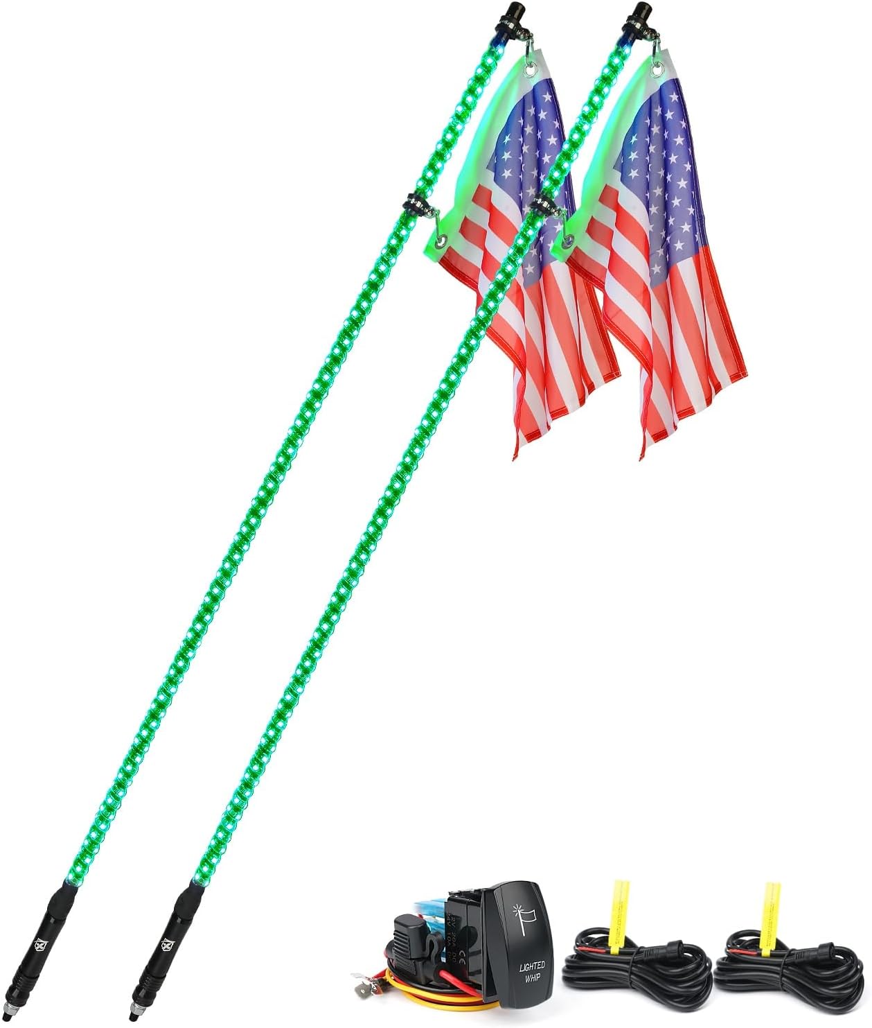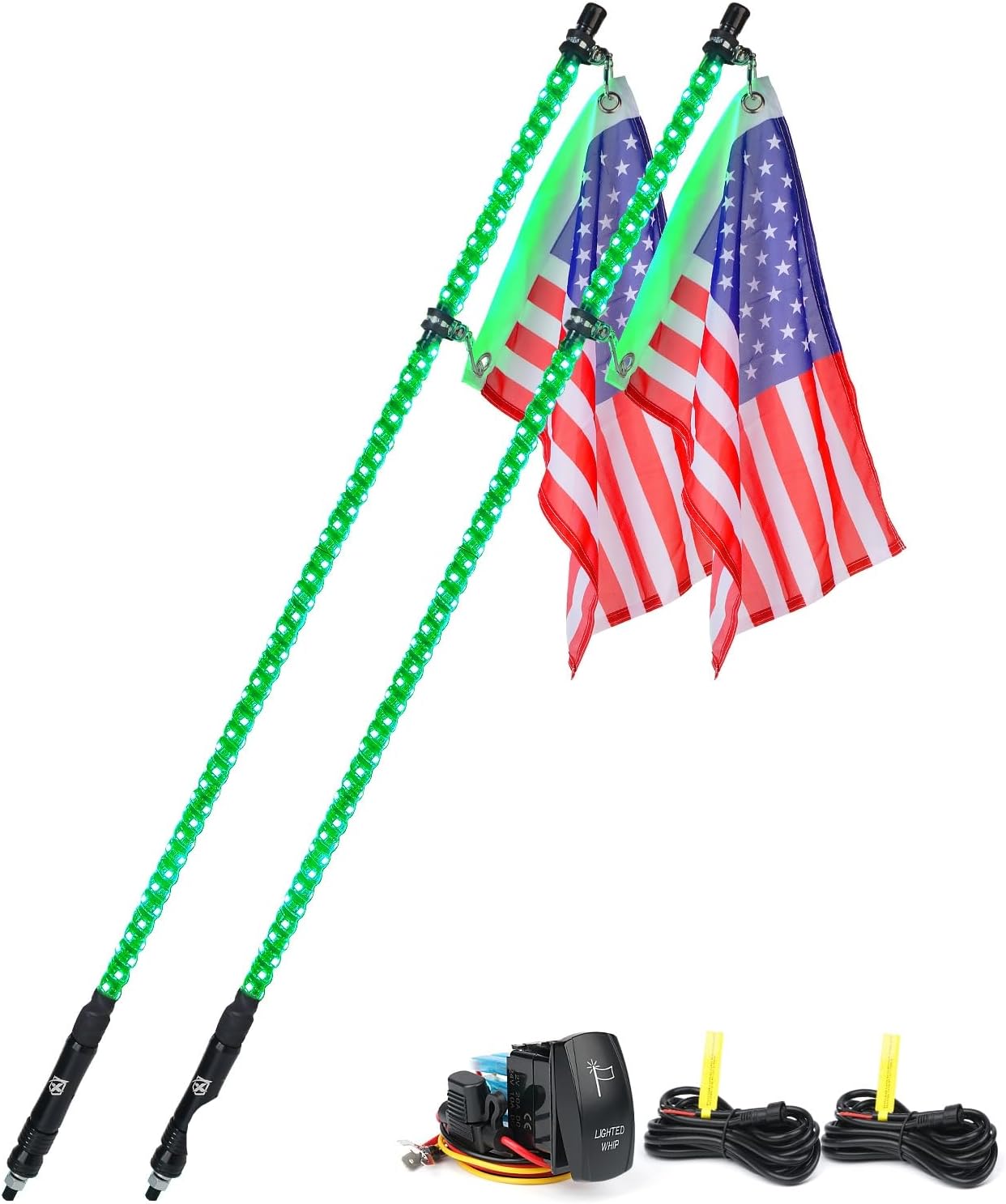 Xprite 2PC 5 FT Green LED Spiral Whip Lights, w/American Flag & Rocker Switch Safety Flexible Antenna Pole Whip Lighting for Offroad Sand Dune Buggy UTV ATV 4X4 Trucks Yamaha RZR Can-am Maverick X3