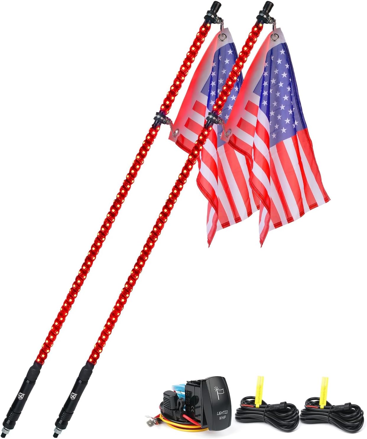 Xprite Red LED 4FT Spiral Whip Lights, 2PCs Flexible Whip Pole Safety Lighted Antenna w/American Flag for Sand Dune Buggy Offroad UTV ATV Polaris RZR Can-Am Maverick X3 4X4 Trucks Jeep Side by Side