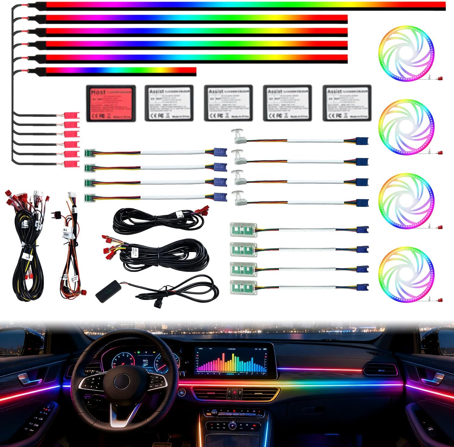 Car Interior Lighting, 22-in-1 HMYC 128 Colorful LED Acrylic Fiber Optic Strips, Universal Decorative Ambient Lighting with Music-synced Rhythm, app Control, RGB neon Lighting for All Cars