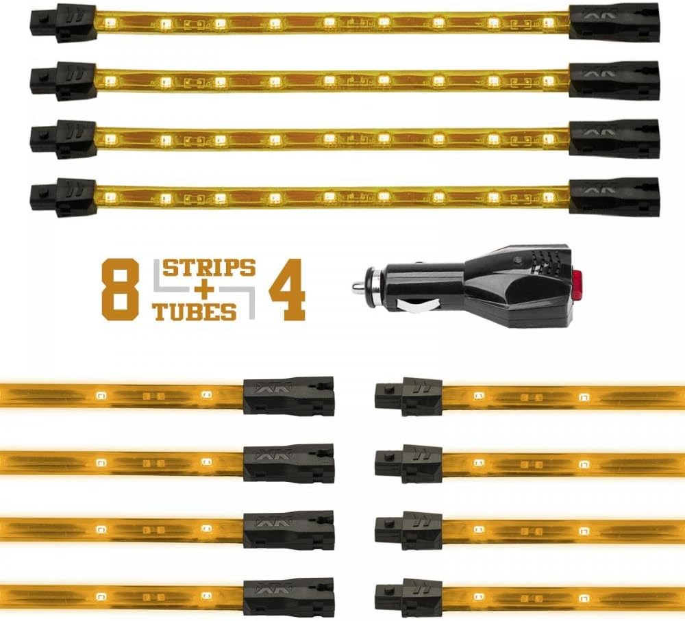Amber Premium 8pcs 24in Tubes 4 Flex Strips Underglow + Car Interior Three Mode LED Neon Accent Light Kit Waterproof Ultra Bright + Plug & Play Ultimate Coverage