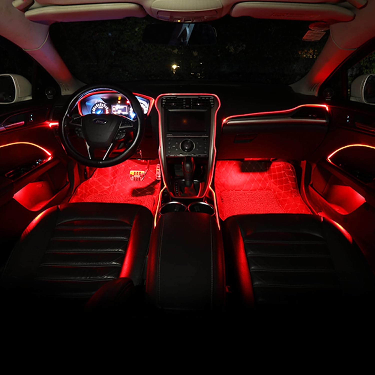 Car Interior Ambient Lighting Optic Fiber Cable RGB 64 Colors Multicoloured Music Car Footwell Lighting Kit with Cigarette Lighter and App Microphone, 12-24V 8m