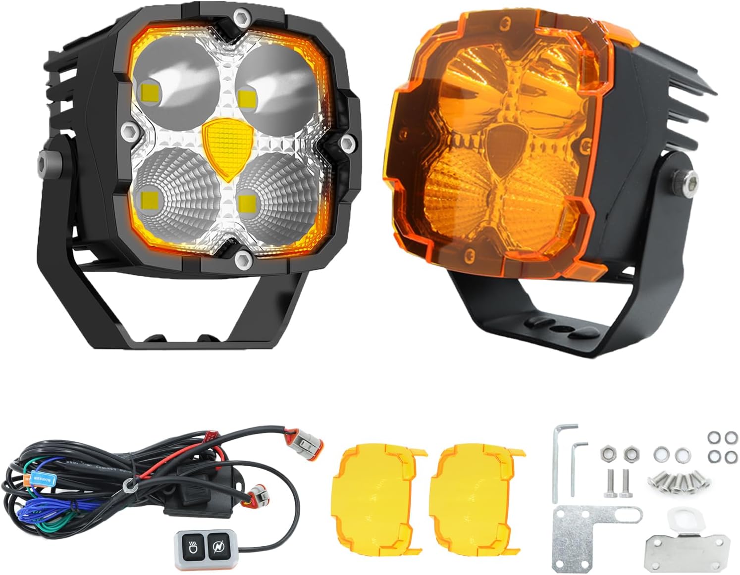 2PCS 120W Offroad Light, 10000LM Super Bright LED, IP68 Waterproof Dustproof, 6000K Cool White 3000K Amber Yellow Cube Pod Ditch Light with Covers and Adjustable Bracket
