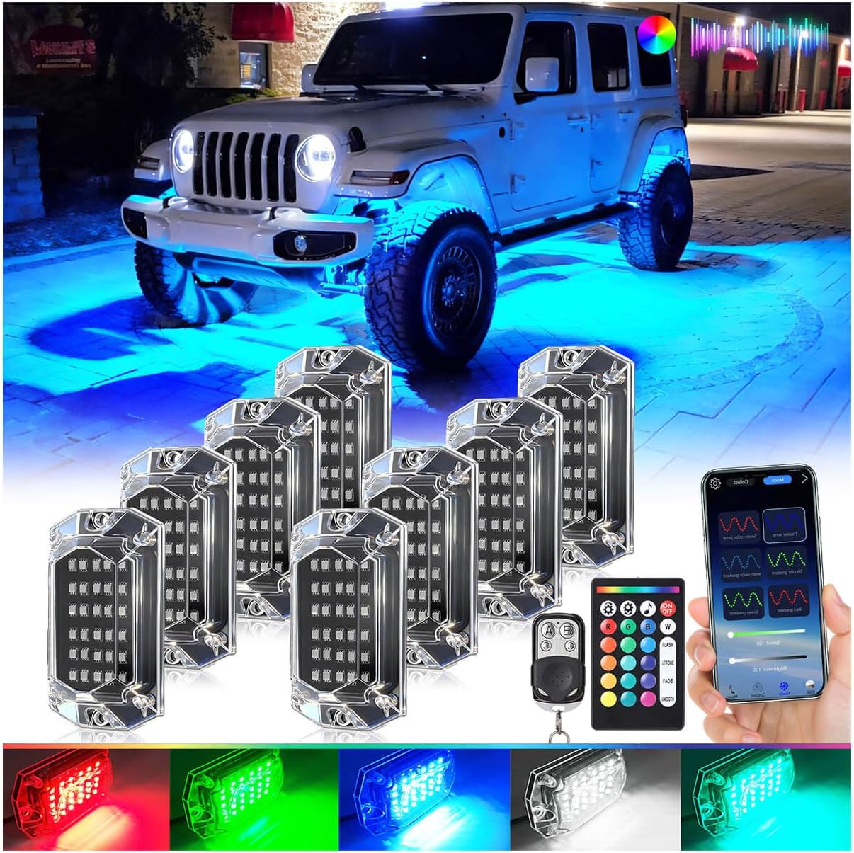 2 Sets 8Pods RGB LED Rock Lights Kit for Jeep Trucks Golf Cart ATV UTV RZR SUV Offroad Pickup Car, Multicolor Underglow Light with APP/RF Remote Control Neon Underbody Light 12V Waterproof