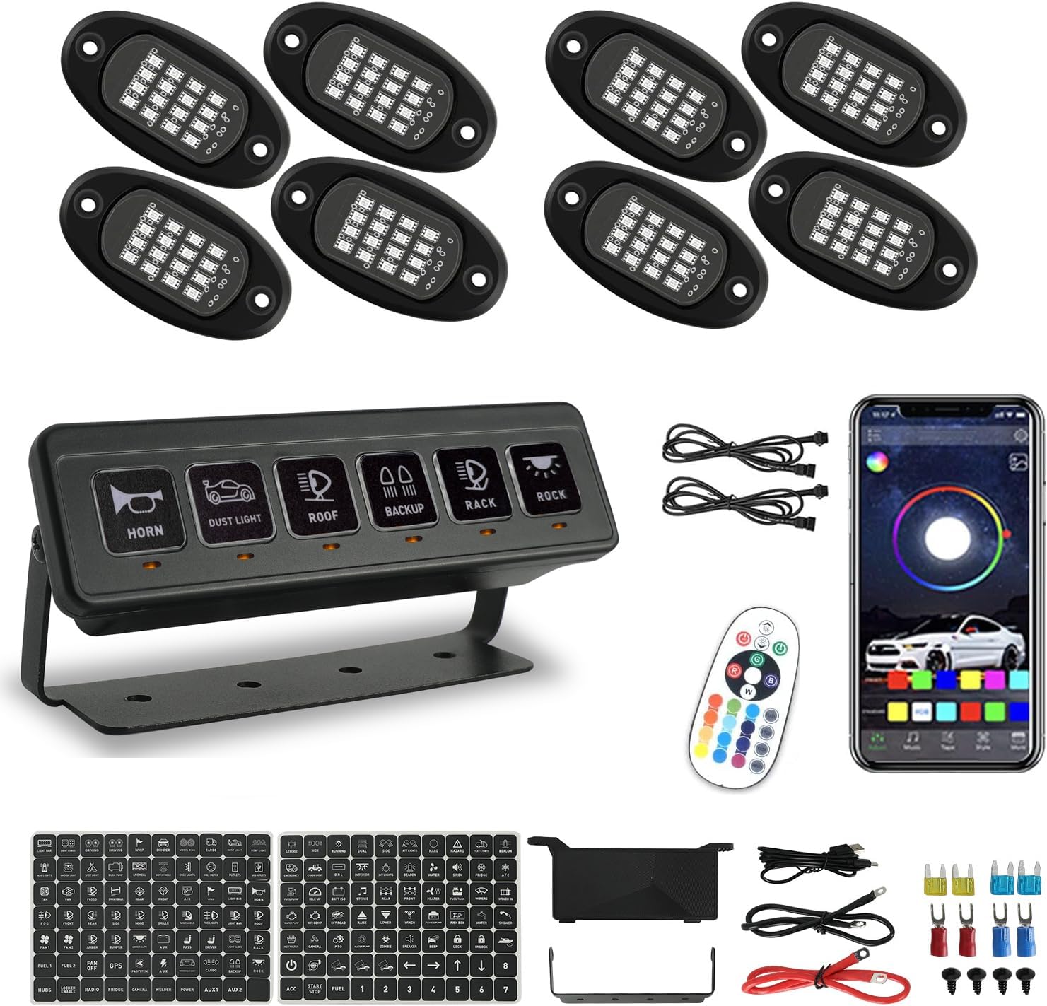 8 Pods RGB LED Rock Lights Wireless 6 Gang Switch Panel Kits Multifunction Offroad LED Light Switch Pod Electronic Relay for Truck Car UTV