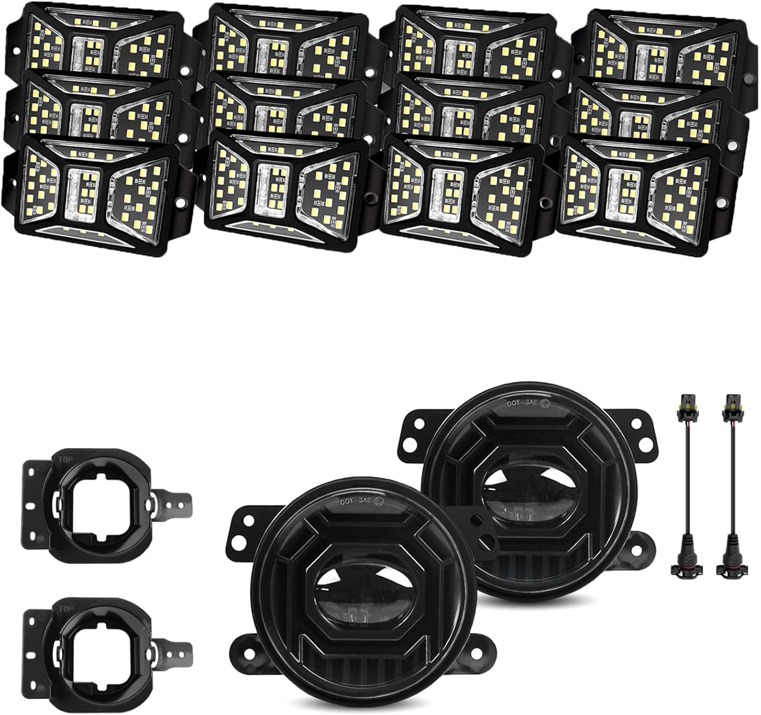 12 Pods Pure White Rock Lights and 2 Packs 4 Inch Led White Amber Fog light for JL