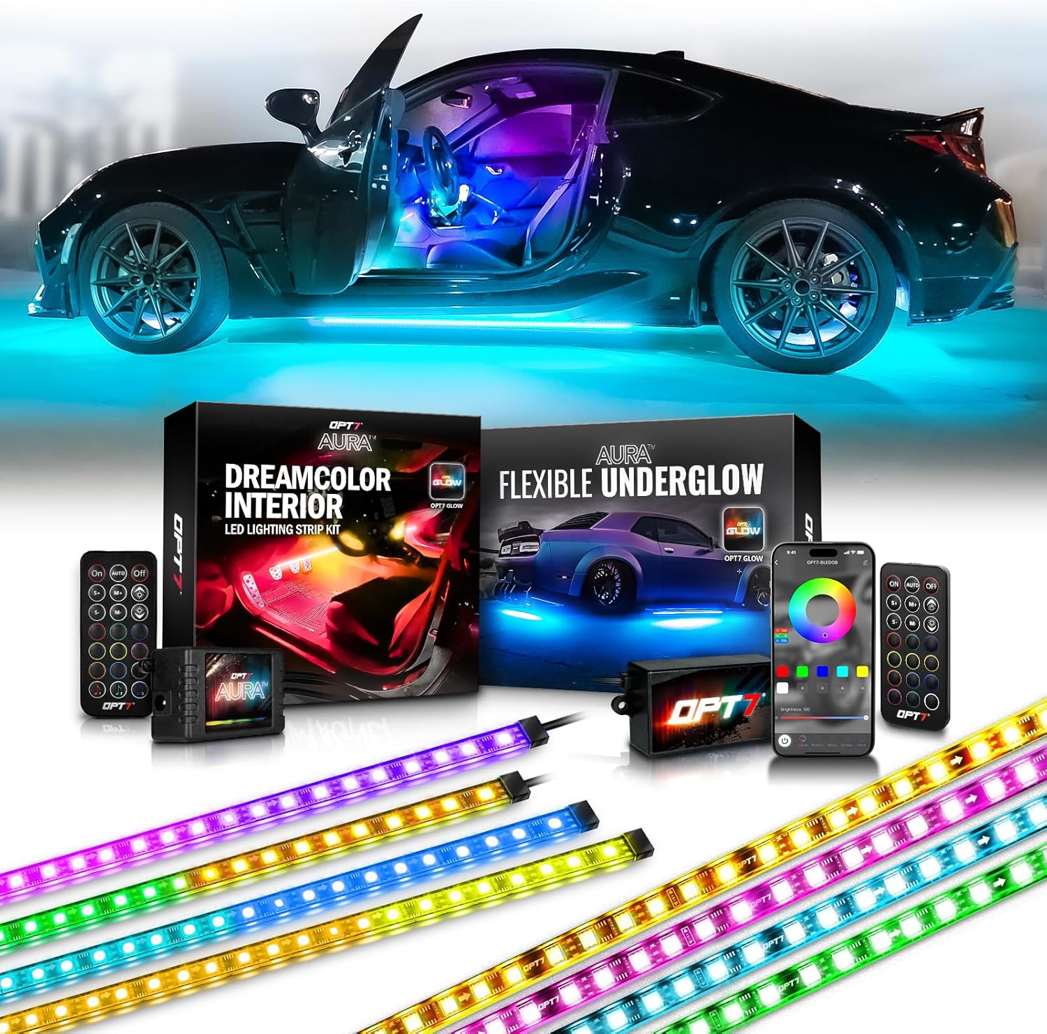 OPT7 Interior Bundle w/Underglow LED Lights for Cars Trucks with App & Remote Control, Music Sound Sync, Neon Underbody Lighting Kit, RGB Multicolor Car Ambient Decor