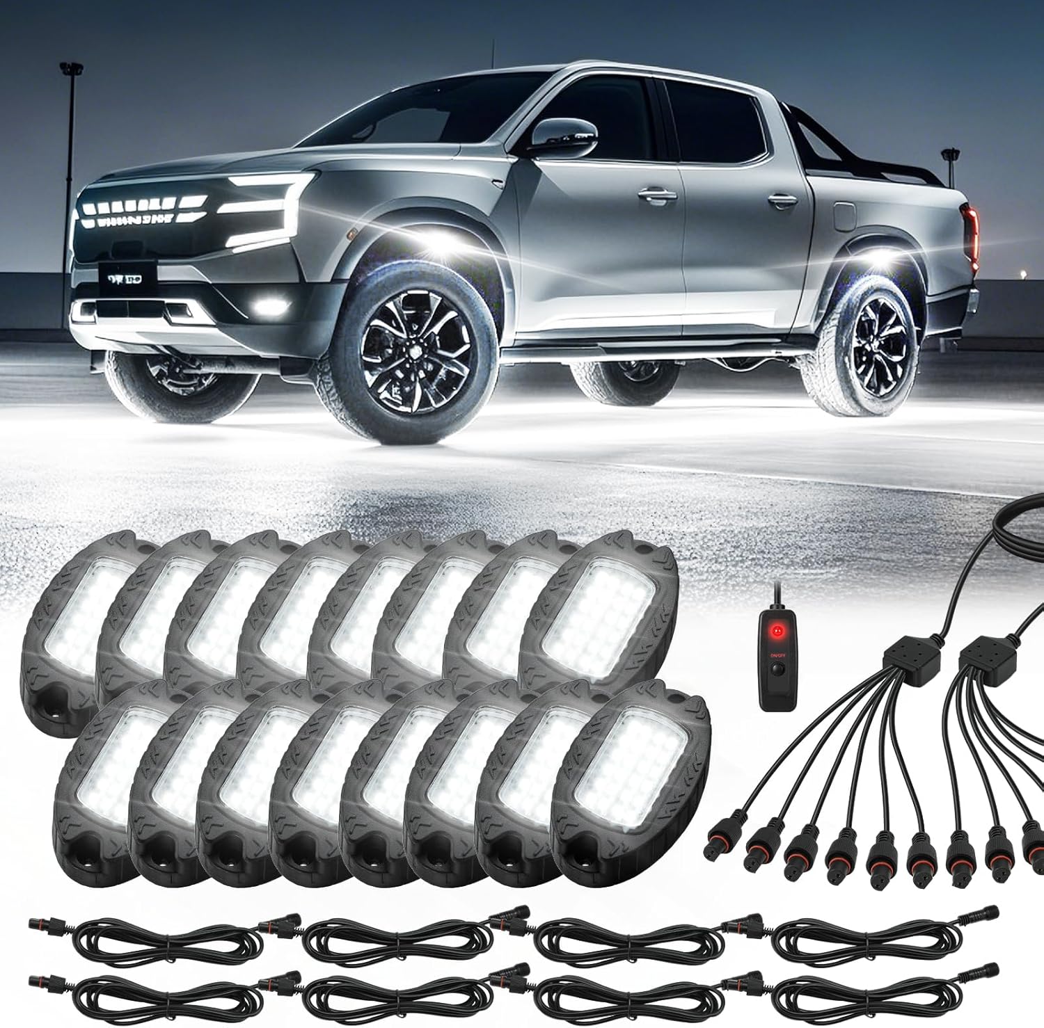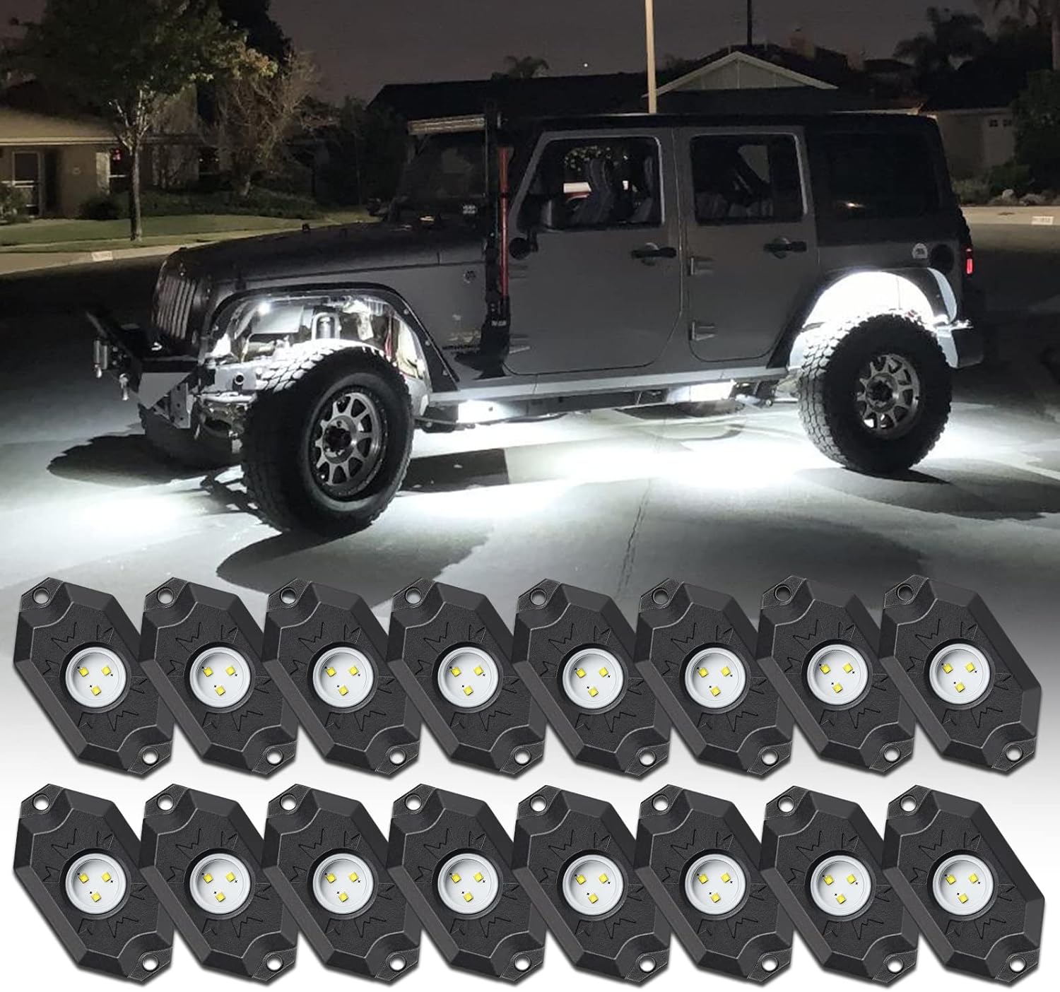 16 Pods Pure White LED Rock Lights, IP68 Waterproof Aluminum 6500K Bright White Underglow Light with Extension Cord Harness,12V Metal Fender Lights for Trucks Off Road UTV ATV Car Golf Trailer Etc