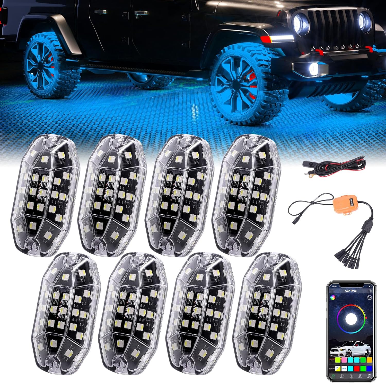 SUNPIE 8 Pods T15 Side RGBW Rock Lights High Power Aluminium Metal Underglow Wheel Well Lights with Phone App Remote Control Voice Mode Music Mode for Off Road Truck SUV ATV UTV Boats