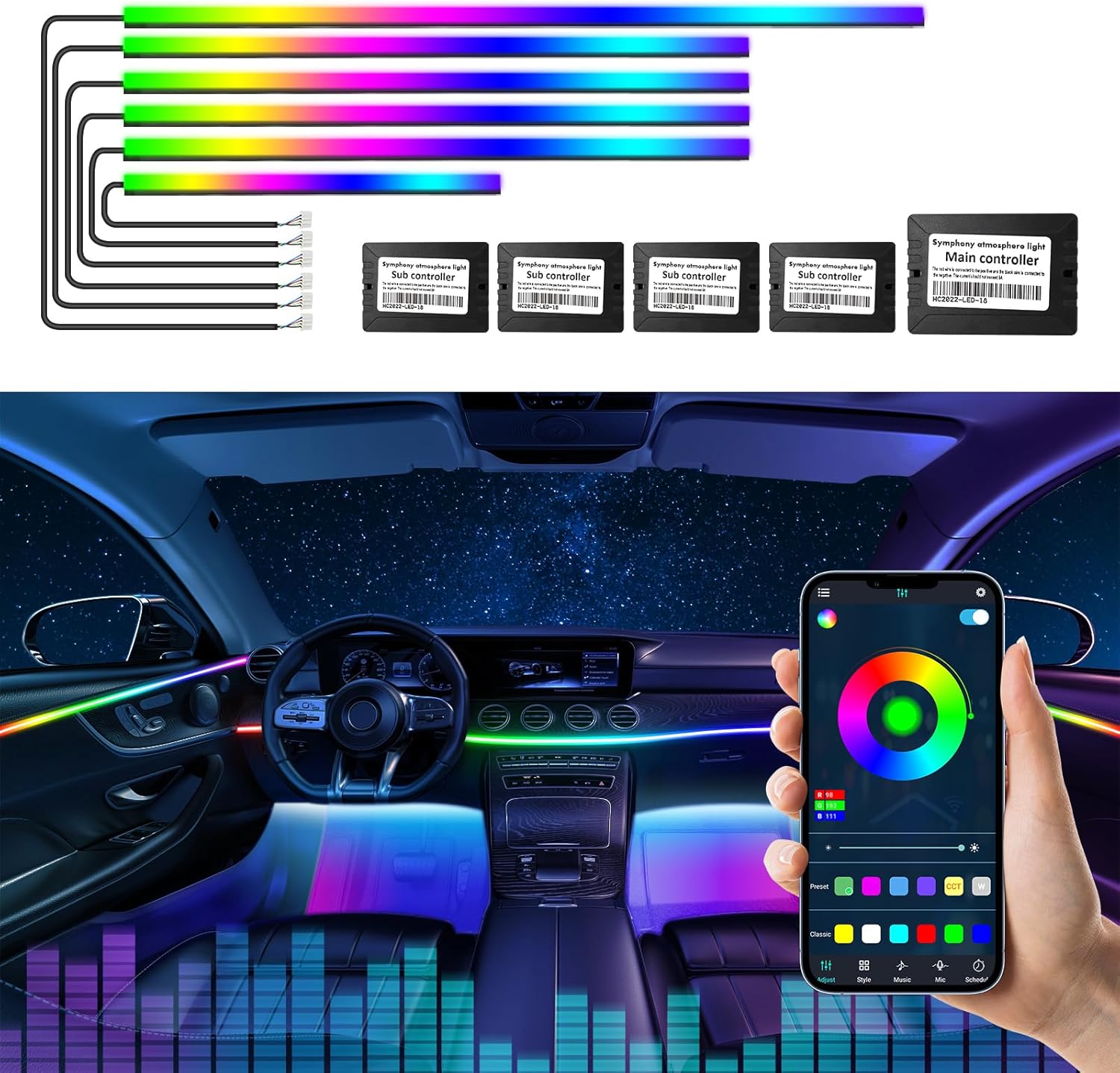 Neoflow Dynamic RGB Interior Light Kit, 6 Light Strips Kit, LED Lights for Car with Dynamic Color Chasing, for Lnterior Into A Dynamic and Colorful Space (1*Kit+4*Synced Footwell Lights)
