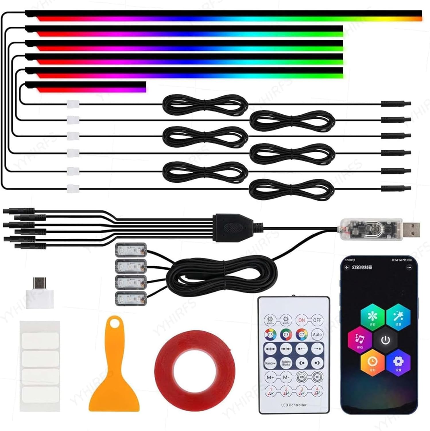 Acrylic Interior Car Lights, AMKI Car LED Strip Light with Bluetooth APP, Car Ambient Lighting Kit with RGB 6 in 1 and 175 inches 593 LEDs, 16 Million Colors Sound Activated Car Neon Lights
