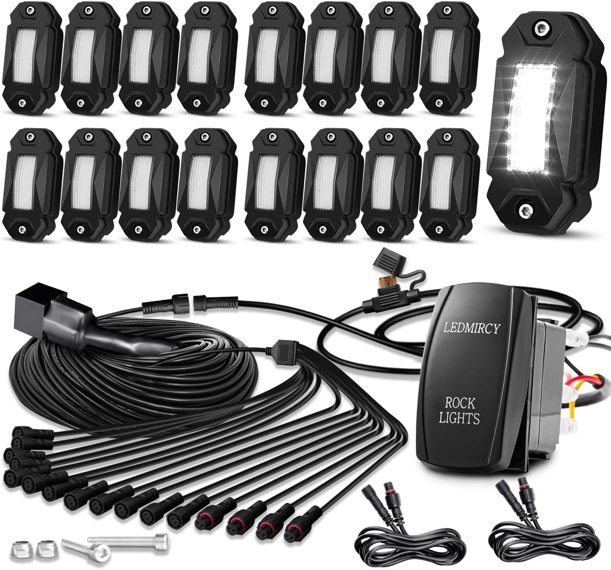 LEDMIRCY R2 Pure White Rock Lights Kit with Rocker Switch Wire Harness 16PCS Rock Lights White for Offroad Trucks ATV UTV SUV Underglow Light Trail Rig Light Under Body High Power Waterproof
