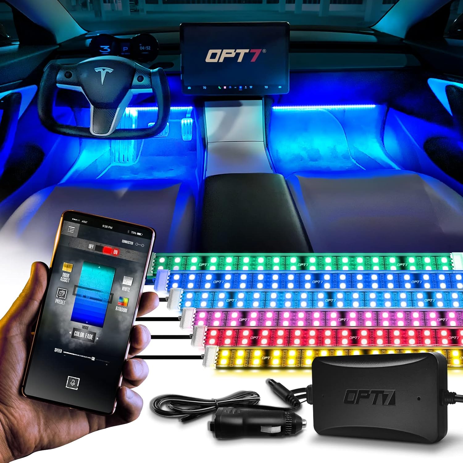 OPT7 Aura Pro 6PC Double LED Interior Strip Lights with APP & Remote Control, Multicolor Mode, Sound Active Inside Ambient Lighting Kit, Truck SUV RV Footwell Floor Decor, 12V Car Charger