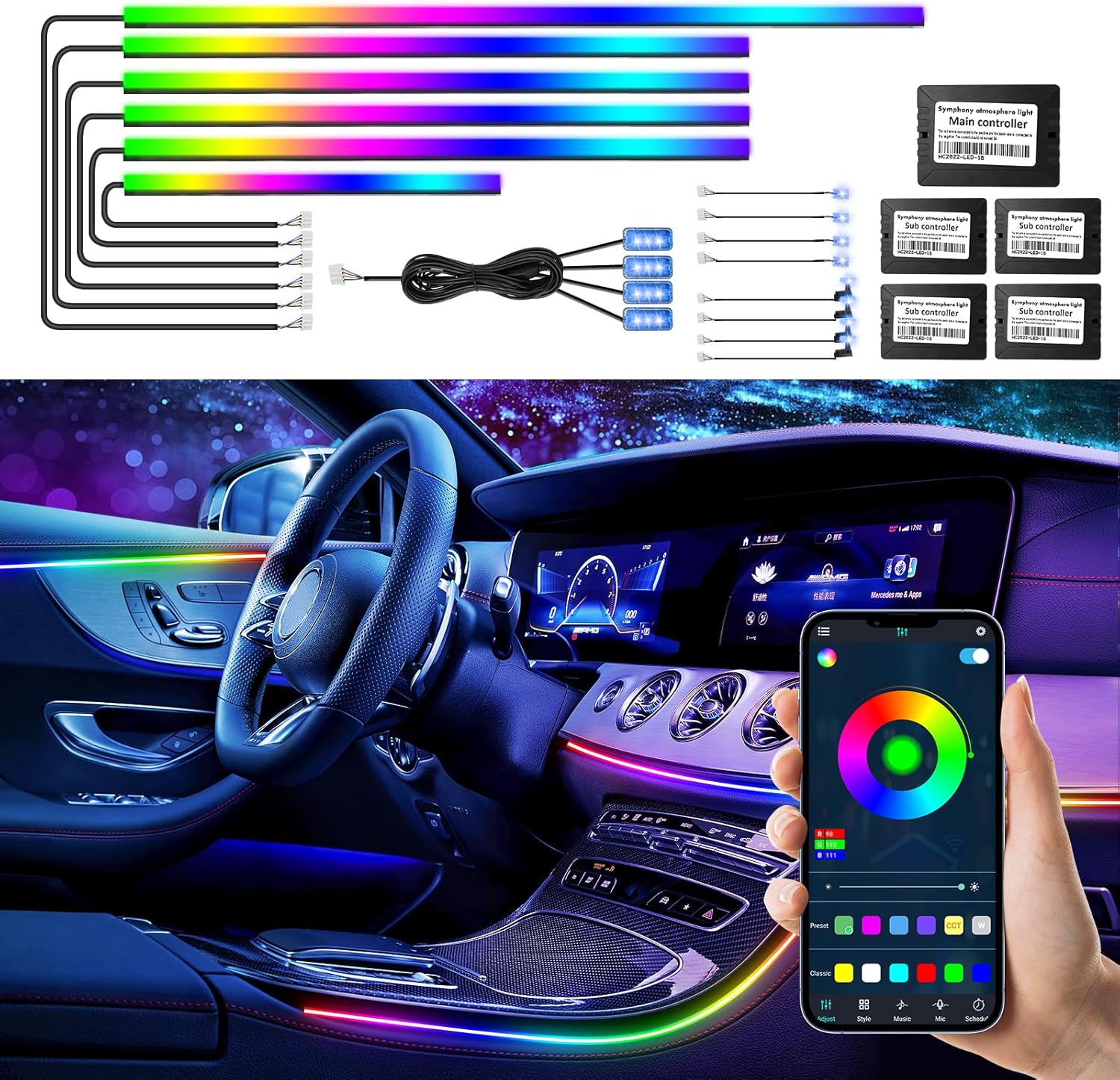 Dreamcolor Acrylic Interior Car LED Strip Light with Wireless APP, RGB 22 in 1 with 175 inches 600 LEDs Fiber Optic Car Ambient Lighting Kits, Dual Zone Sound Active Function LED Strip for Car