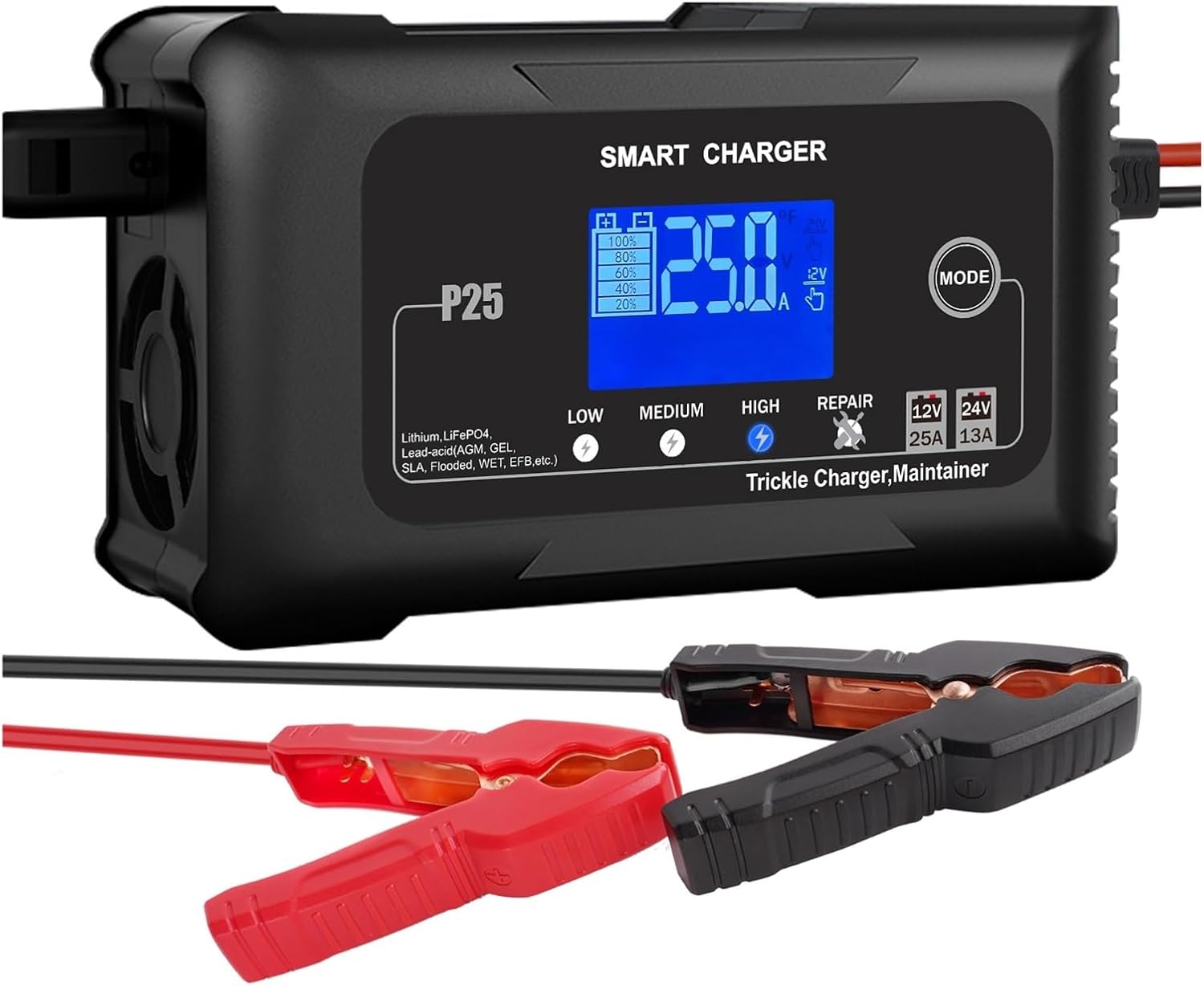 25A Car Battery Charger 12V 24V Puls Repair Charger for Lead Acid lifepo4 AGM Gel Wet Battery Truck Motorcycle Charger(EU Plug)
