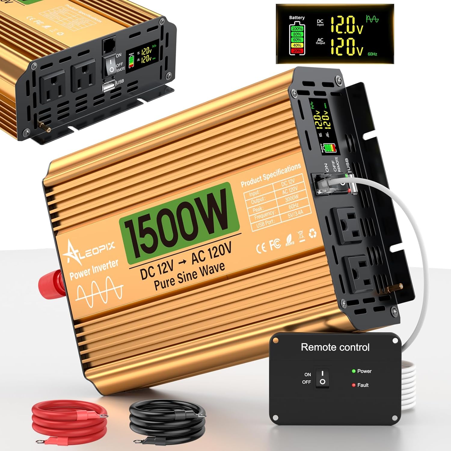 1500 Watt Inverter 12V DC to 110V/120V AC, Pure Sine Wave Inverter for Truck/RV/Home/Solar/Off-Grid, Surge 3000W Pure Sine Power with 2 AC Sockets, 5V 3.4A USB, Digital Display, Remote Controller