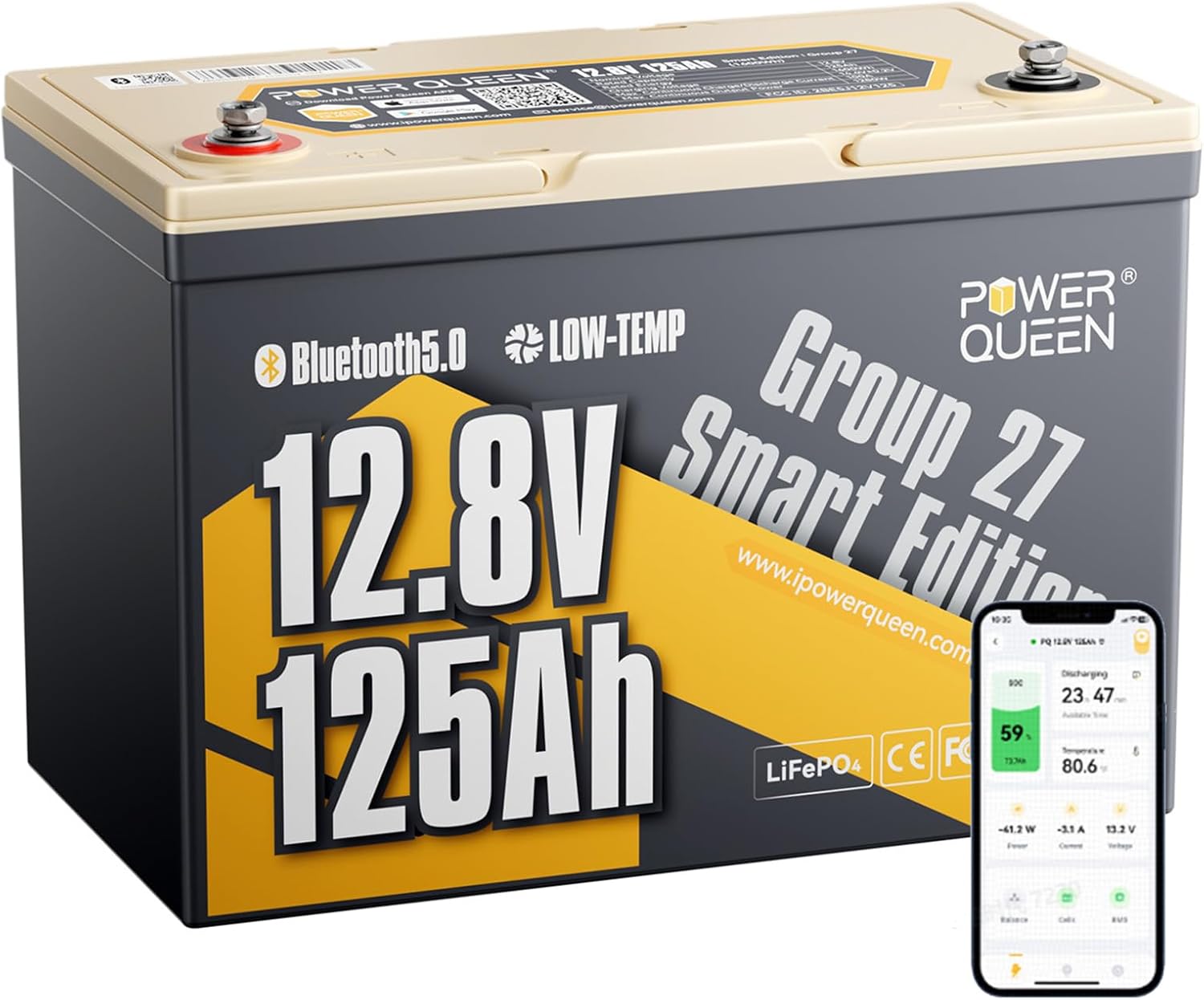 Power Queen 12V 125Ah Group 27 Bluetooth LiFePO4 Battery,1600Wh Energy Lithium Battery with Low-Temp Protection Max. 15000 Cycles for RV, Solar System, Trolling Motor