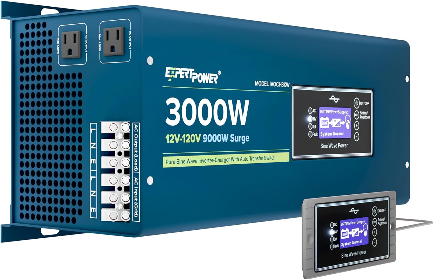 ExpertPower 3000W Pure Sine Wave Inverter Charger | Peak 9000W | DC 12V - AC 110V | LifePO4/ Lithium Battery Compatible | Auto Transfer Switch | External Display
