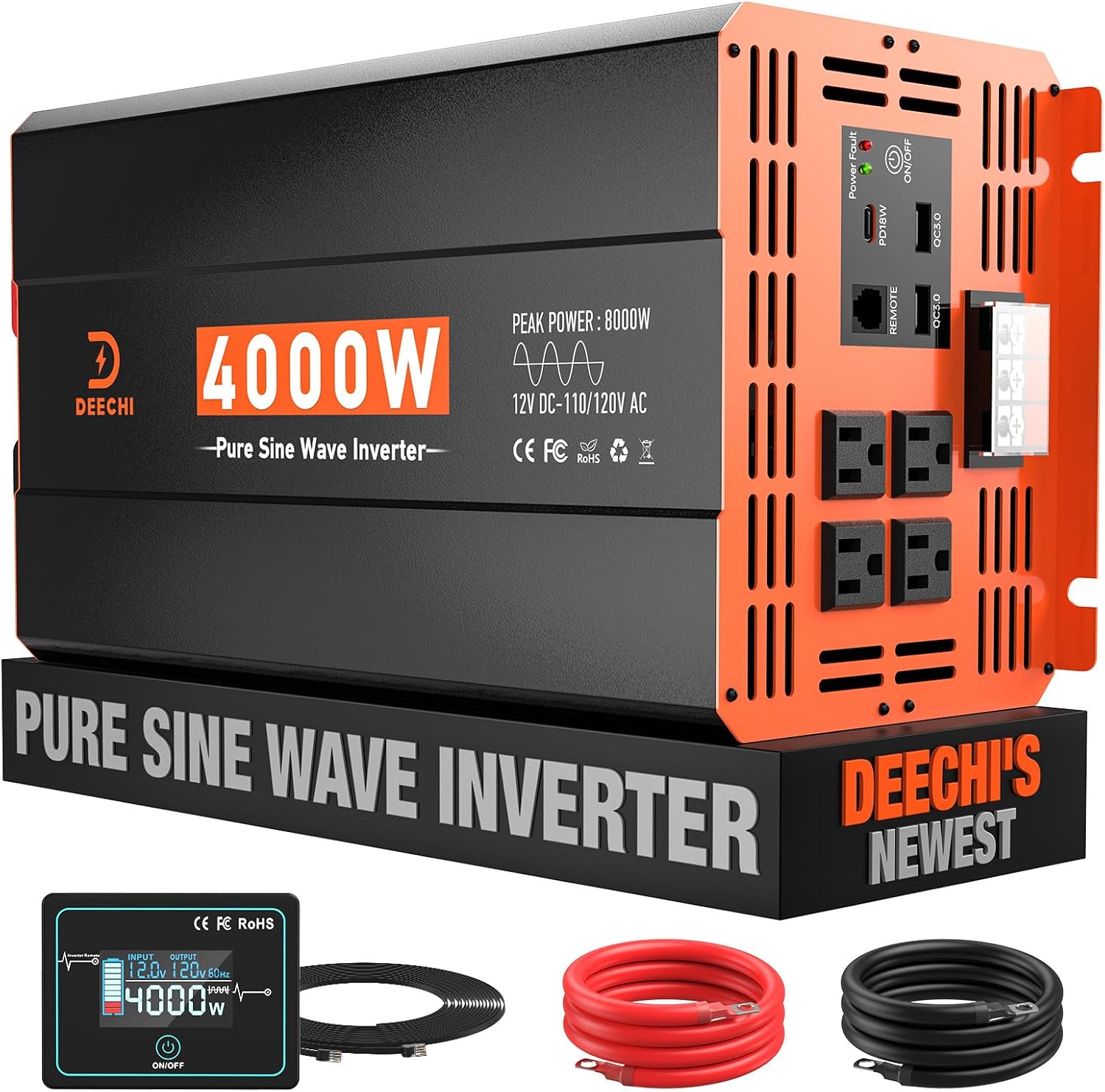 4000 Watt Pure Sine Wave Inverter 12V DC to 110V/120V AC Converter for RV/Truck/Home/Off-Grid Solar Car Power Inverter for Vehicles with 4 AC, 2 USB & 1 Type-C Ports, Hardwire Kit, Remote Controller