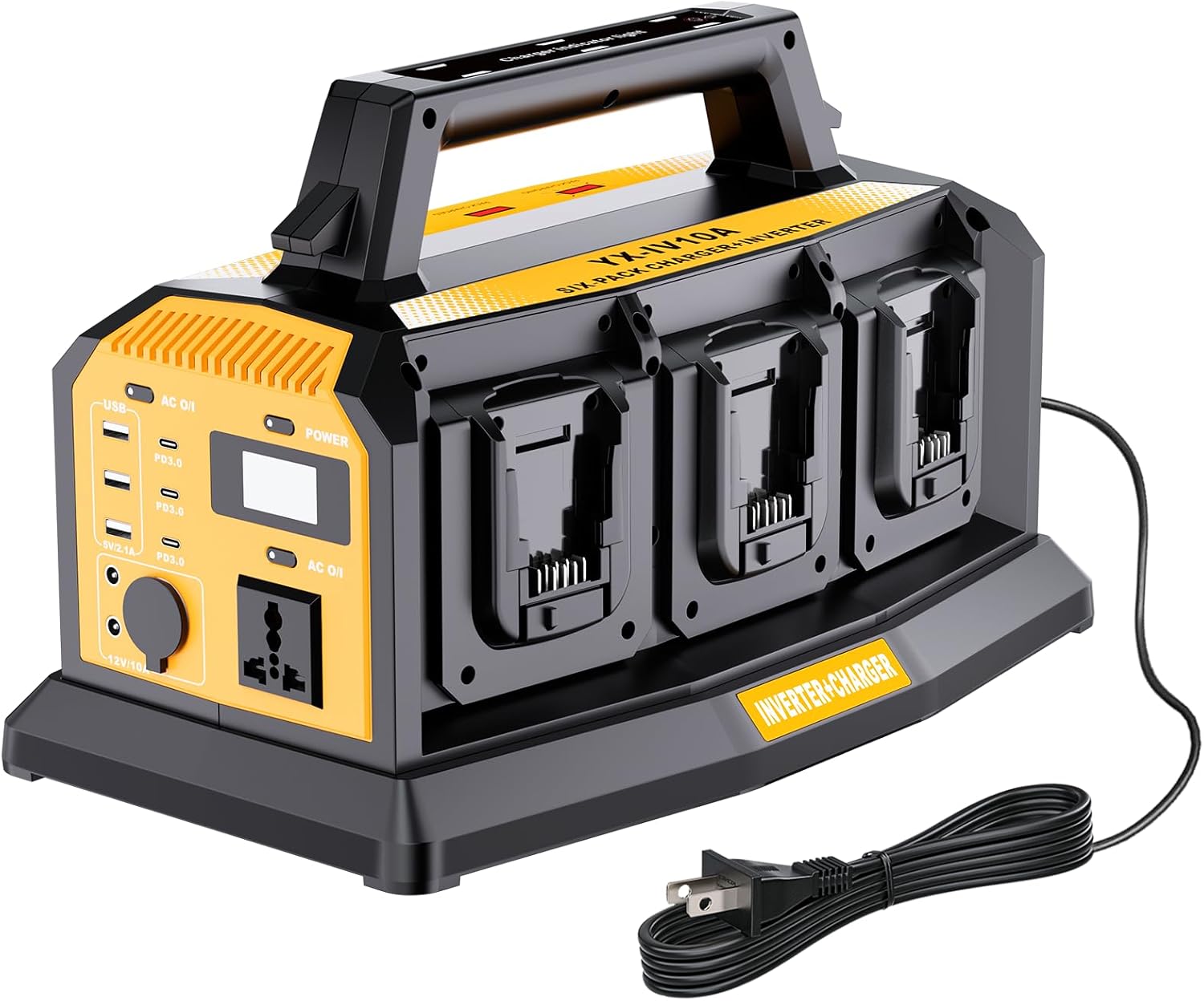 1000W Power Inverter Compatible with Dewalt 20V Li-ion Battery, 6A Battery Charger, 6-Port 20V to 120V Pure Sine Wave Inverter with LED Light 12V Car Socket