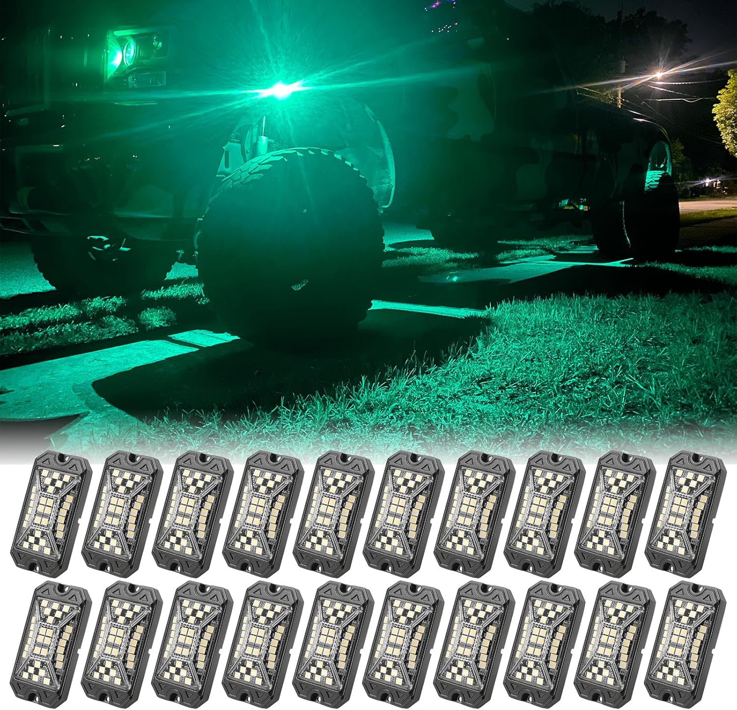 SUNPIE 20 Pods RGBW Rock Lights – Full Beam Angle, 30 High Power Chips, Aluminium Housing, Mounting Pads Included, IP67 Waterproof, Music Mode Underglow Lights, Fits Trucks, SUV, ATV, UTV, Boats